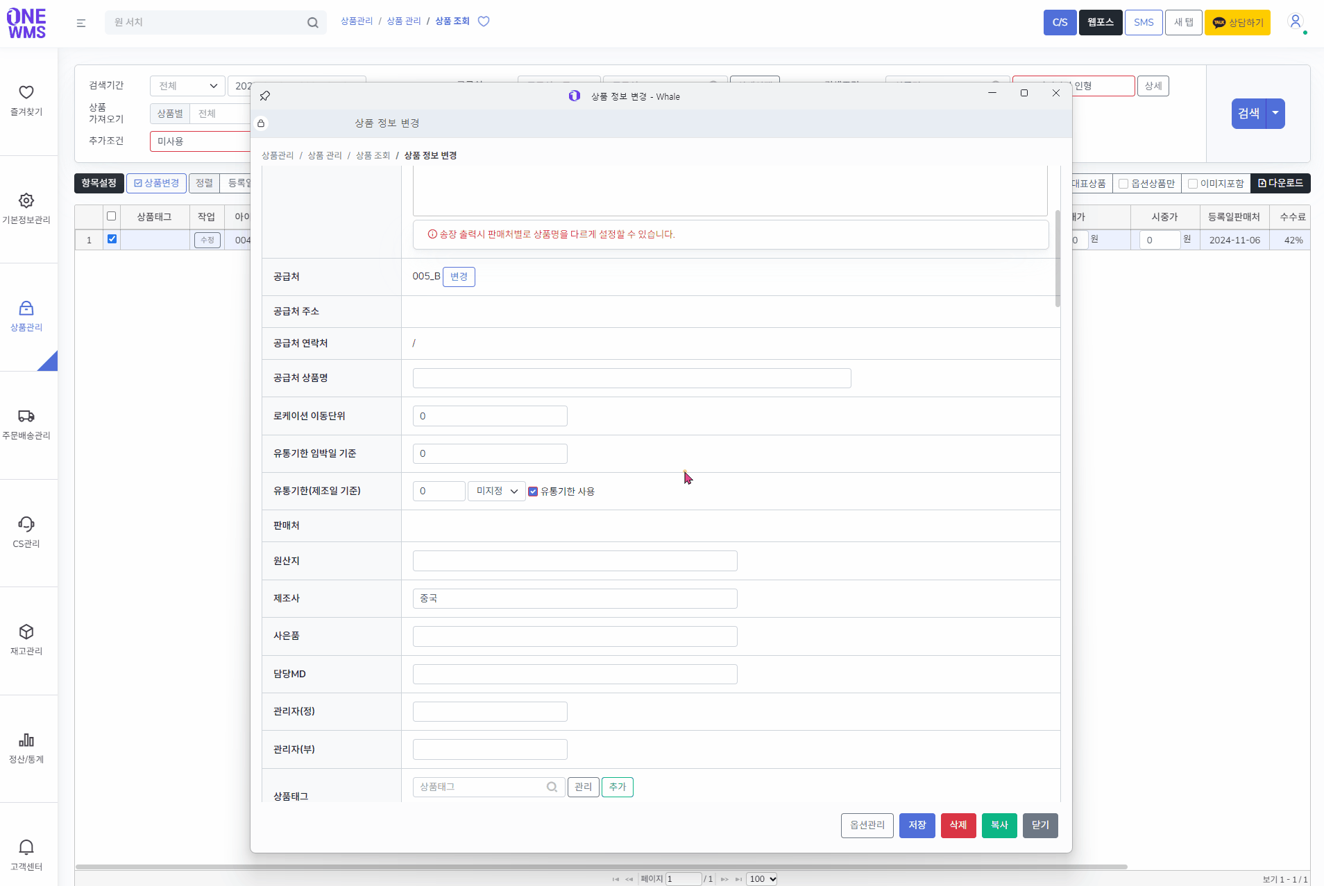 옵션이 없는 상품은 상품정보변경에서 확인됩니다.