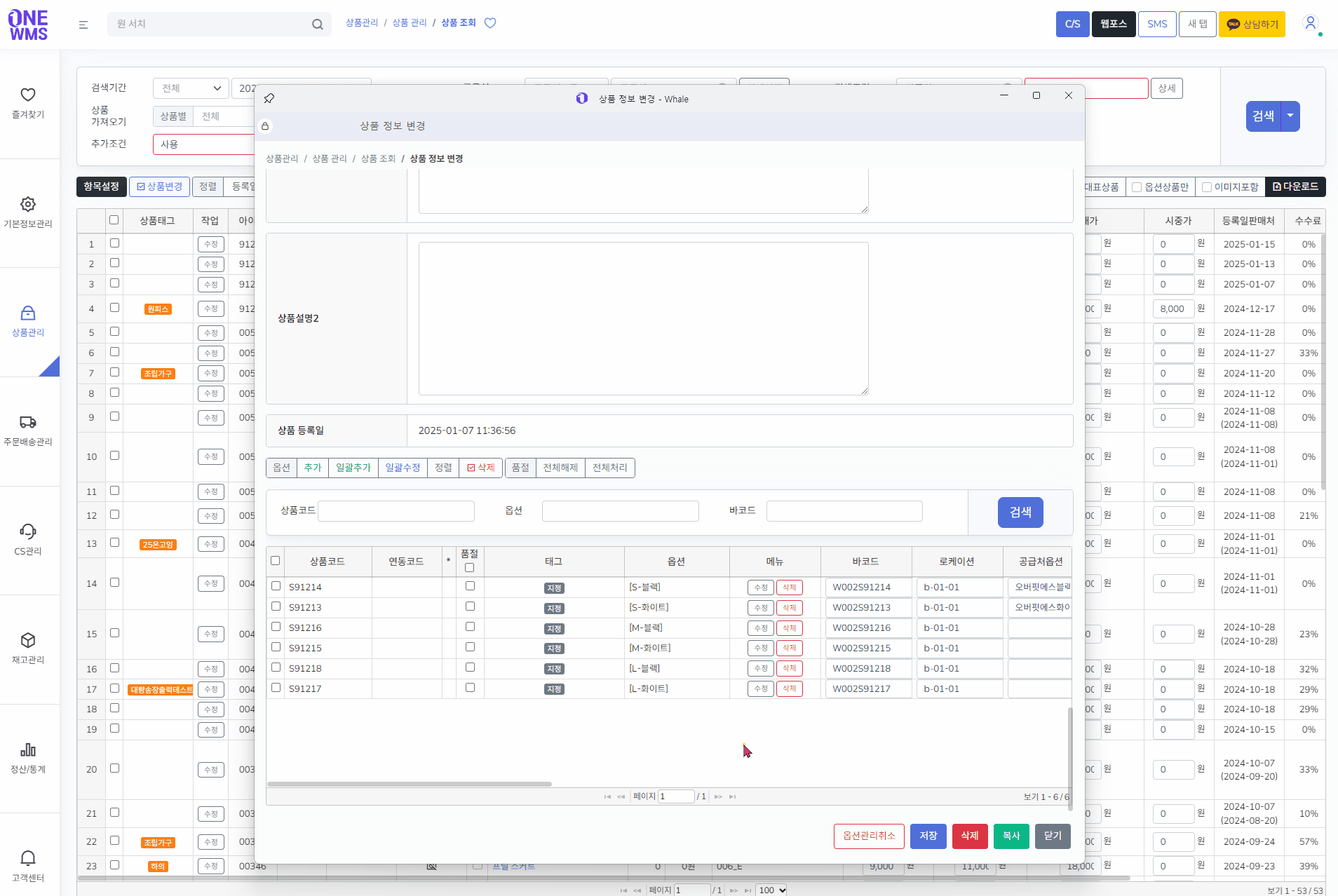 옵션이 있는 상품은 하단 옵션리스트 - [수정] 버튼을 클릭하여 설정할 수 있습니다.