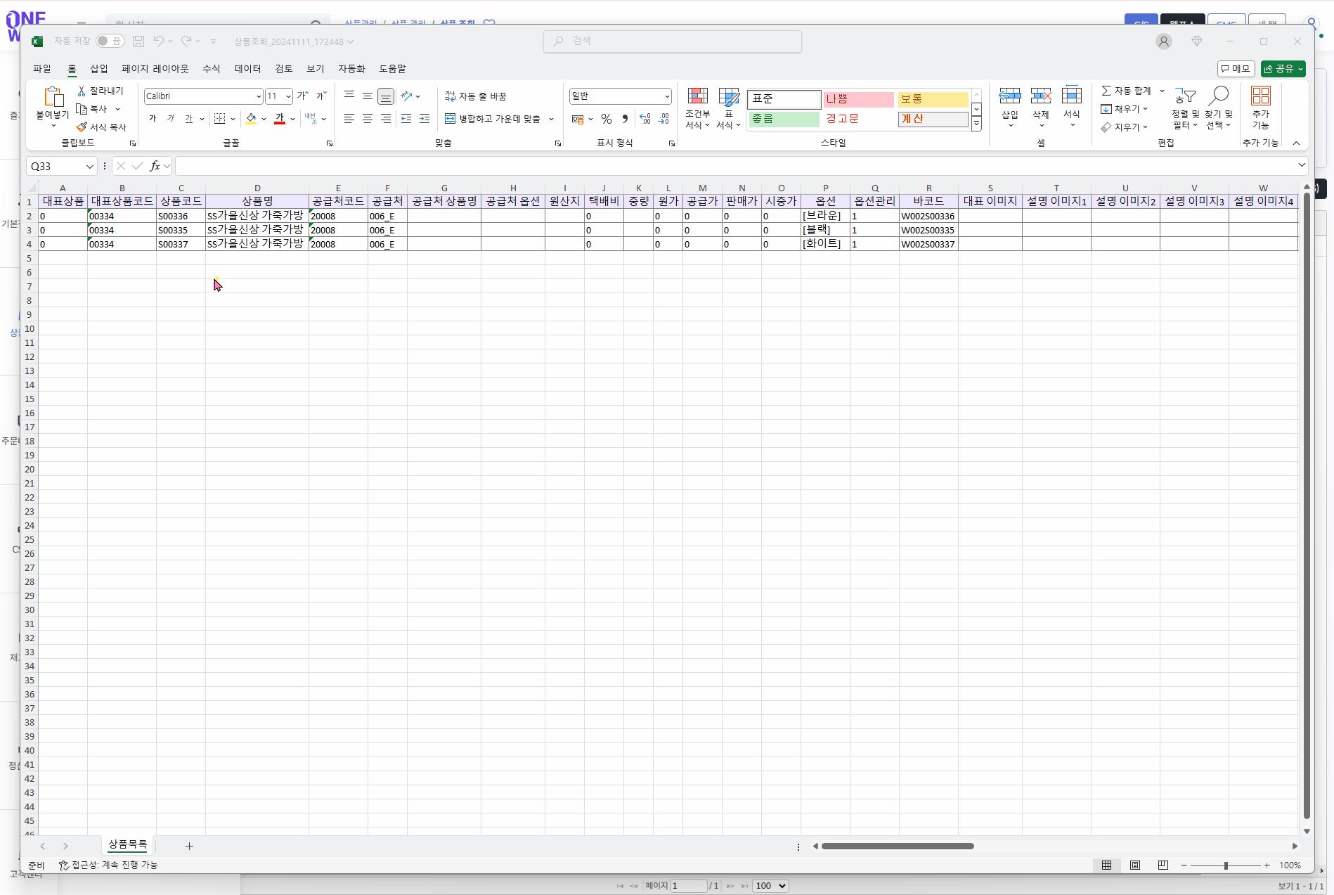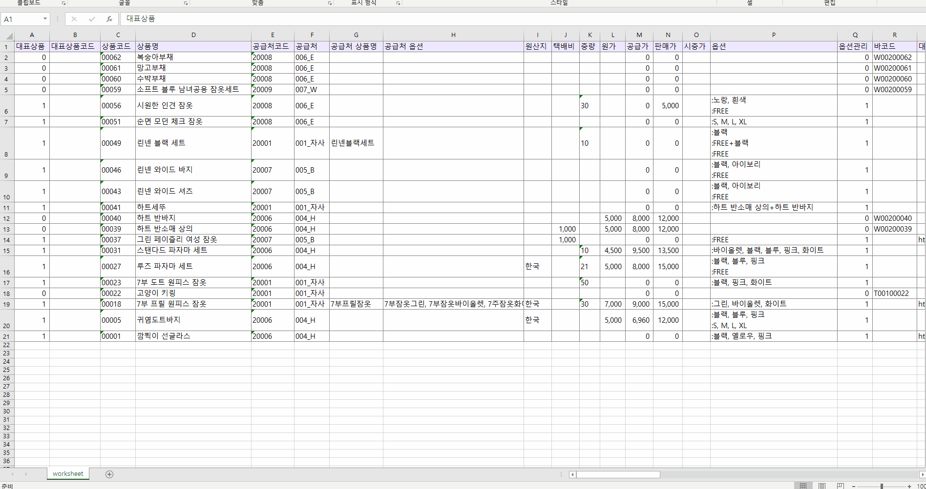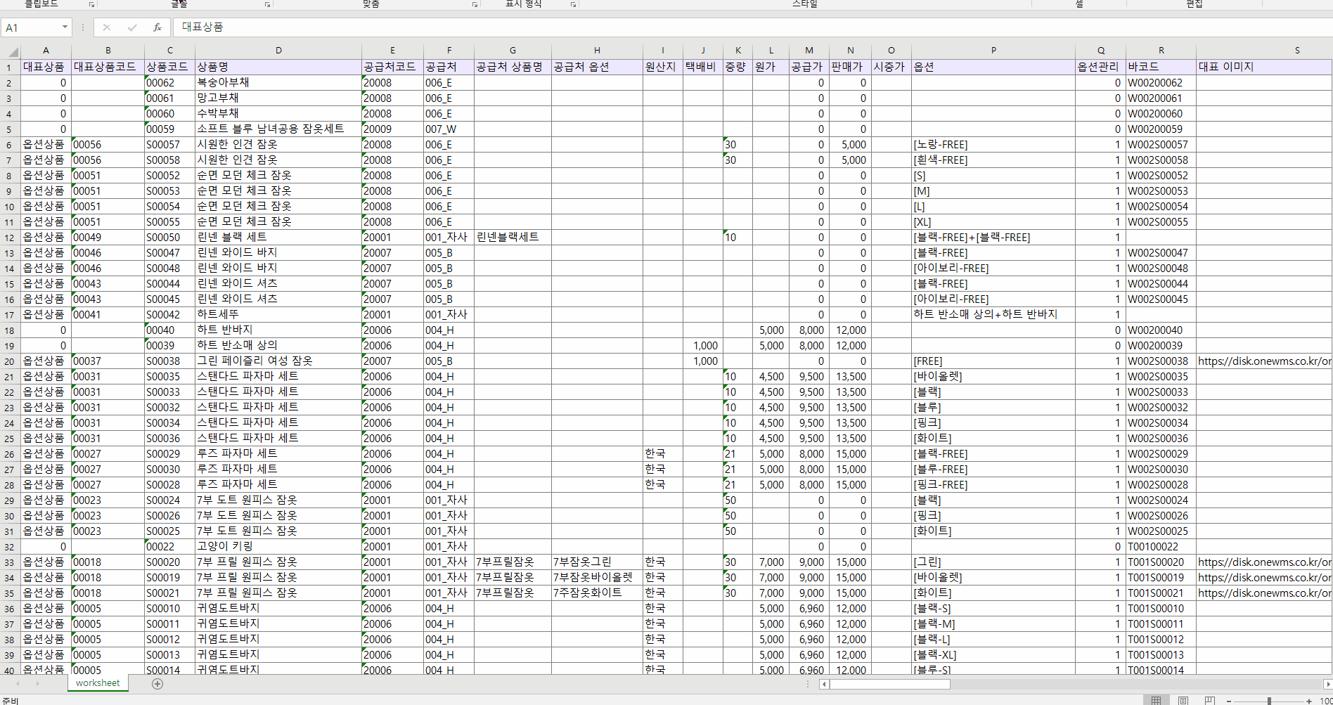 먼저 상품코드 항목을 엑셀 A열에 위치하게 합니다.