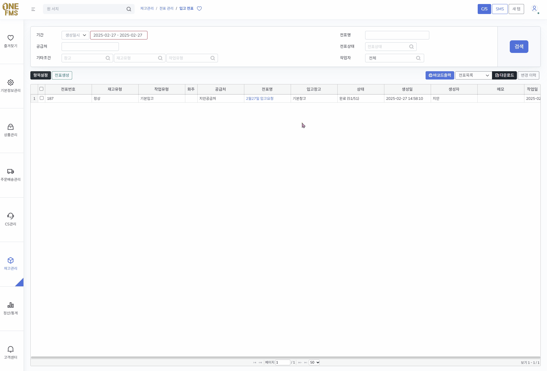 전표는 물류사에서 확인 후 완료처리를 진행하면 전표상태가 완료로 변경됩니다.
