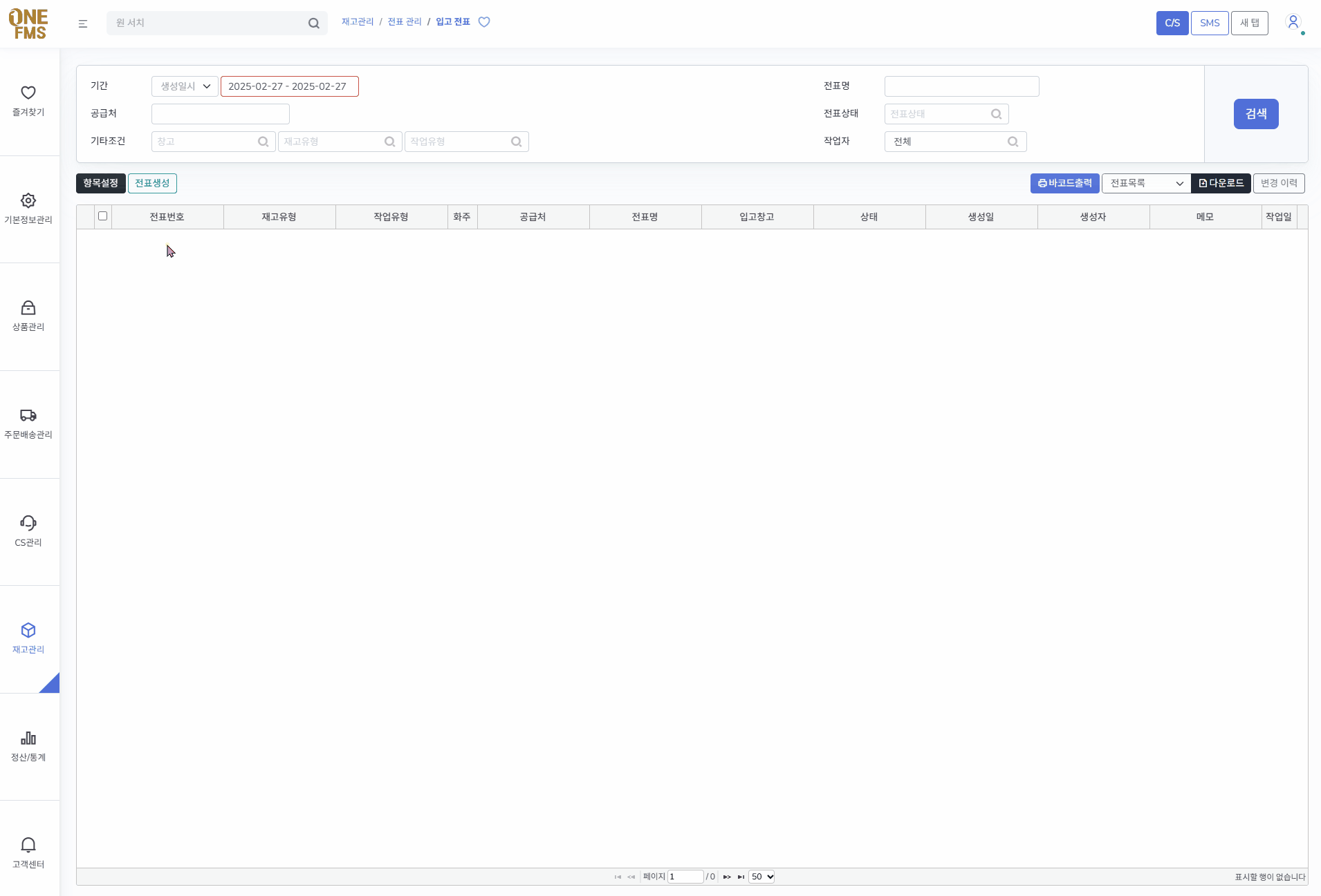 메뉴: [재고관리 > 전표 관리 > 입고 전표]