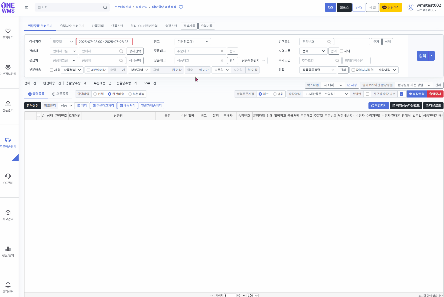 대한통운 휴일배송 주소정제 미체크 시, 휴일배송 가능 지역 여부와 상관없이 할당이 된 주문이 모두 리스트에 나옵니다.