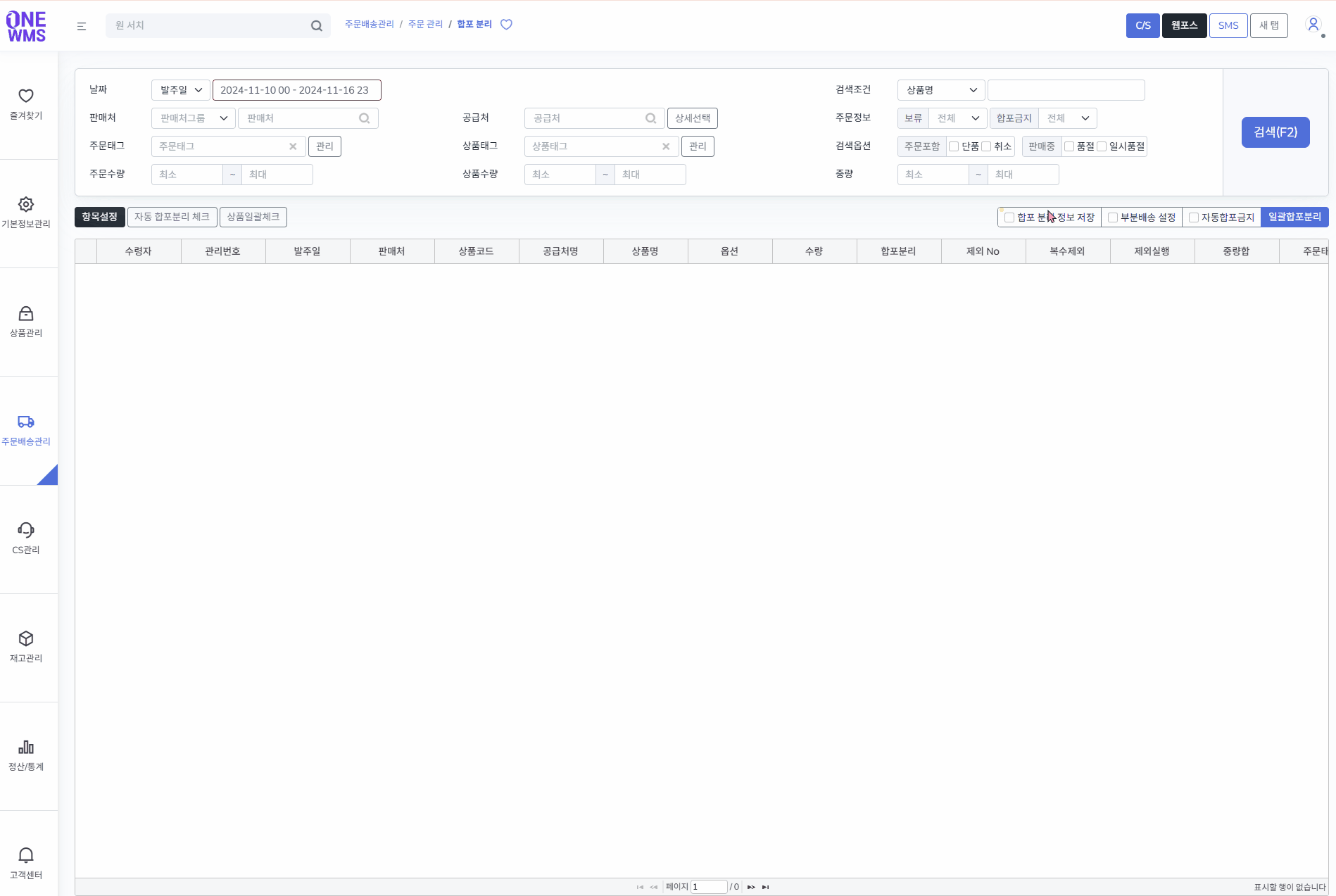 오른쪽 상단의 [검색] 버튼을 클릭하면 검색조건에 맞는 합포 분리가 가능한 주문이 조회됩니다.