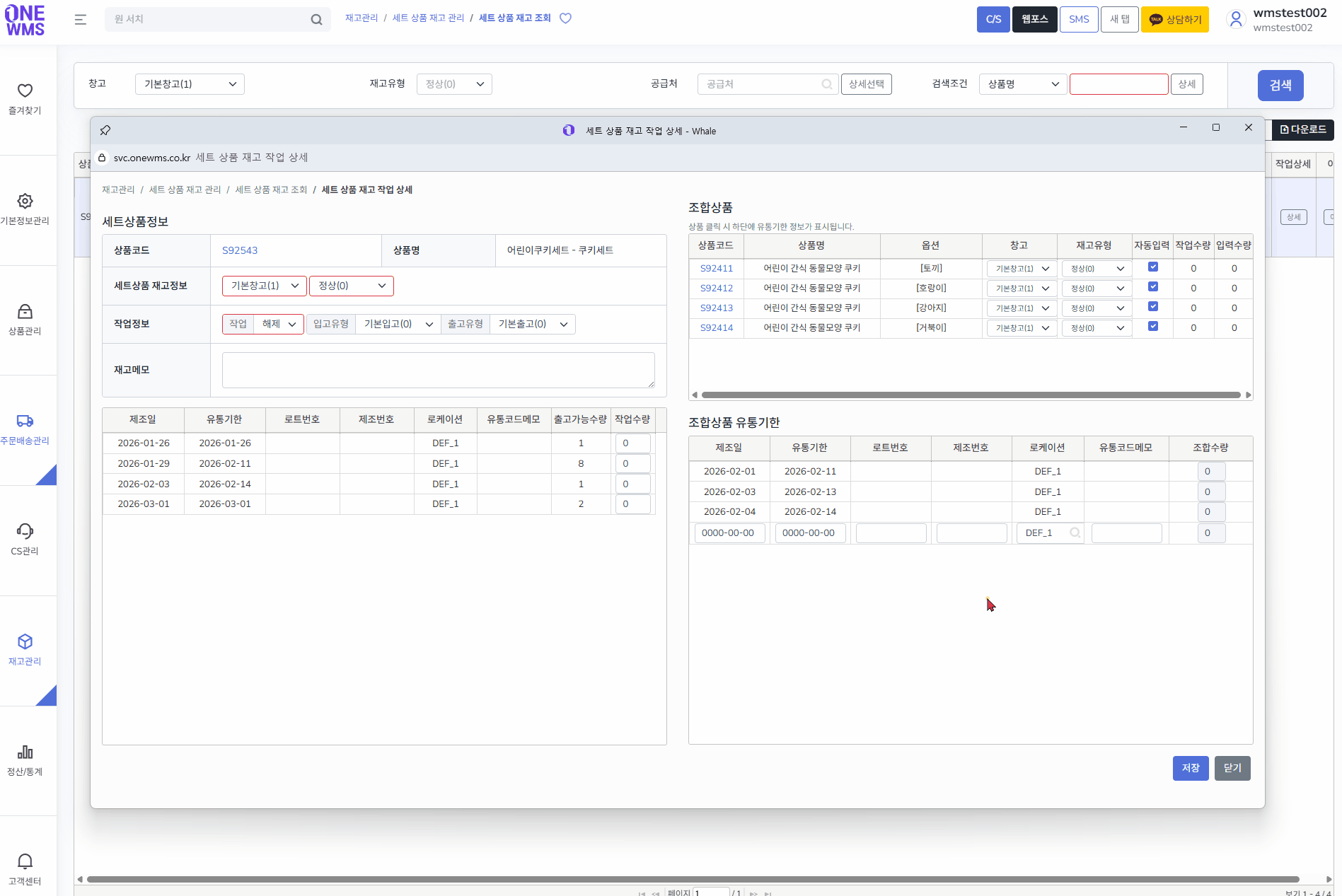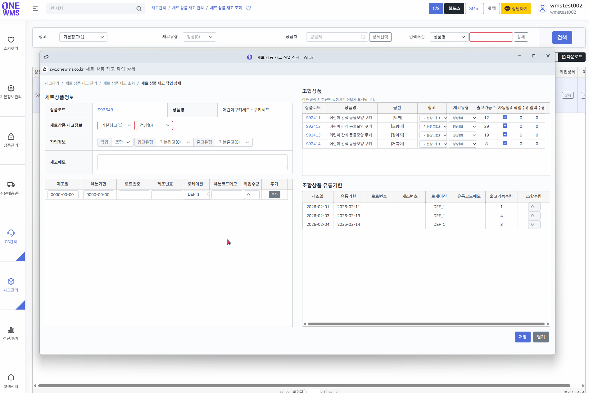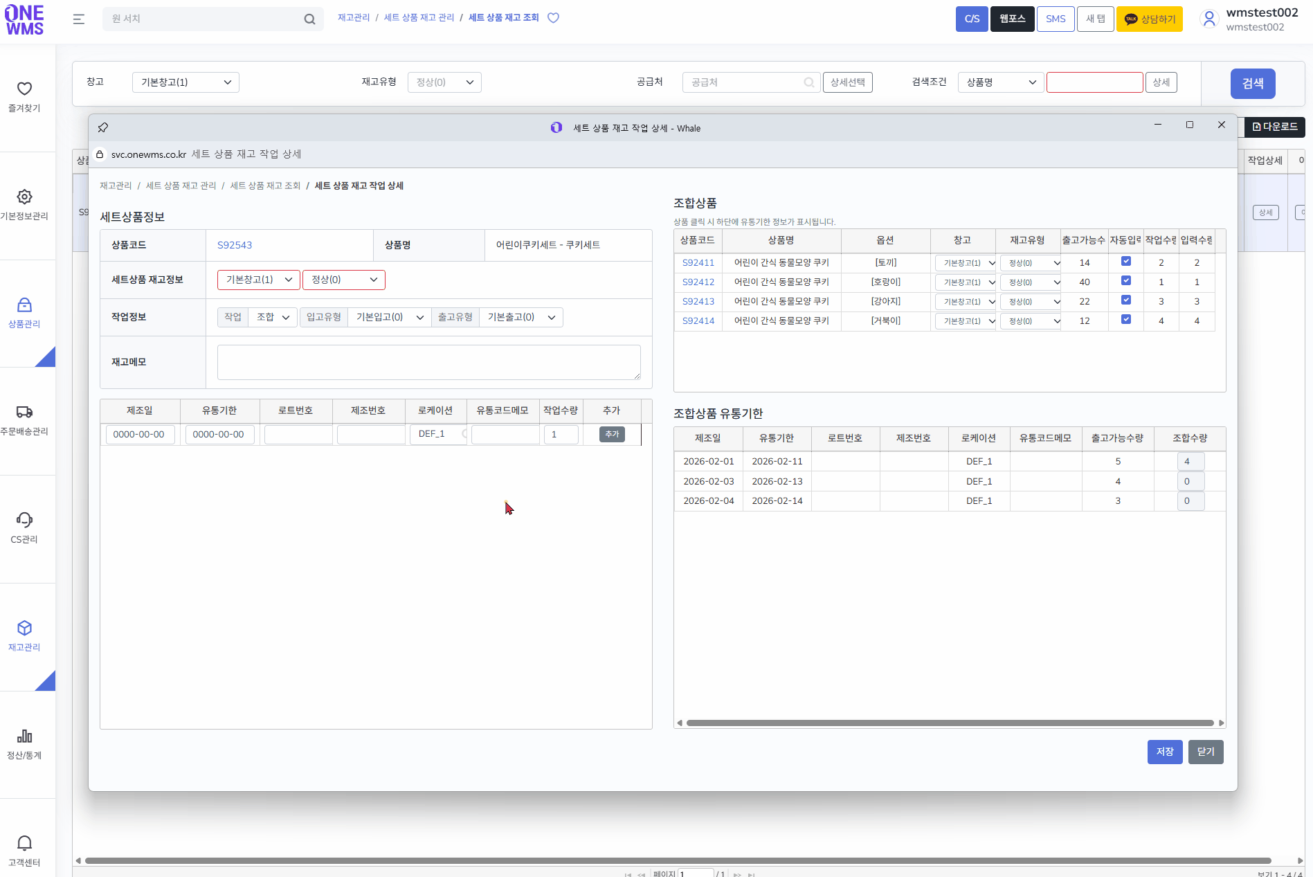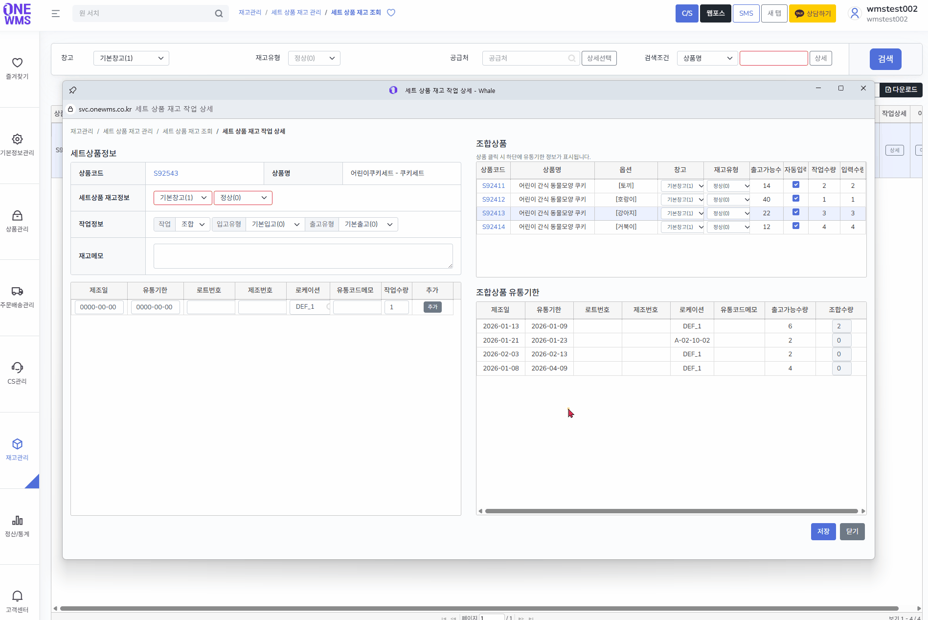 왼쪽 세트상품 정보에서 조합할 세트상품 유통기한 정보를 입력 후 [저장] 버튼을 누르면 조합 처리가 됩니다.