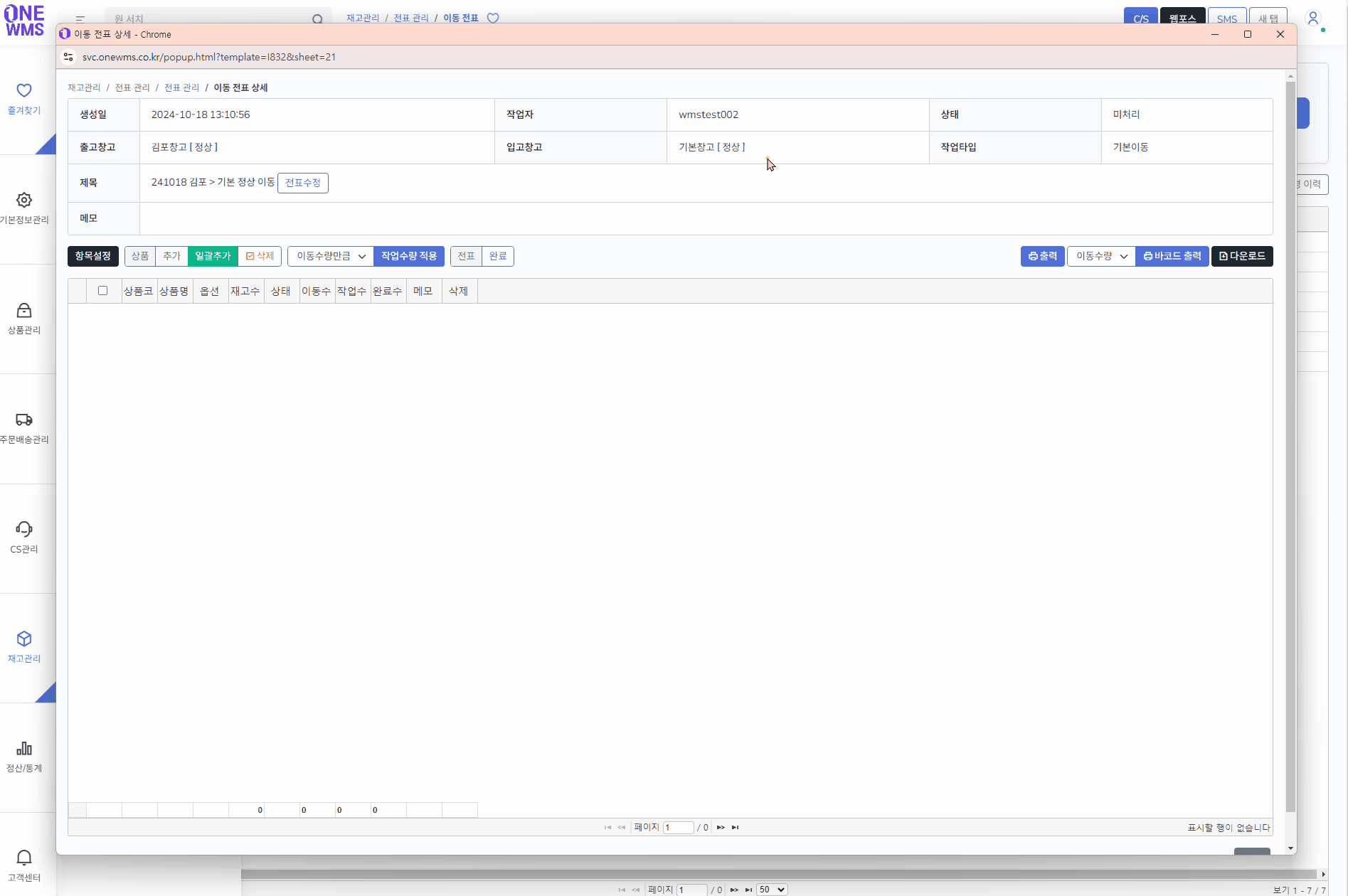 [완료] 버튼을 클릭하면 입력한 작업수량만큼 각각 창고에서 출고 및 입고 작업이 진행됩니다.