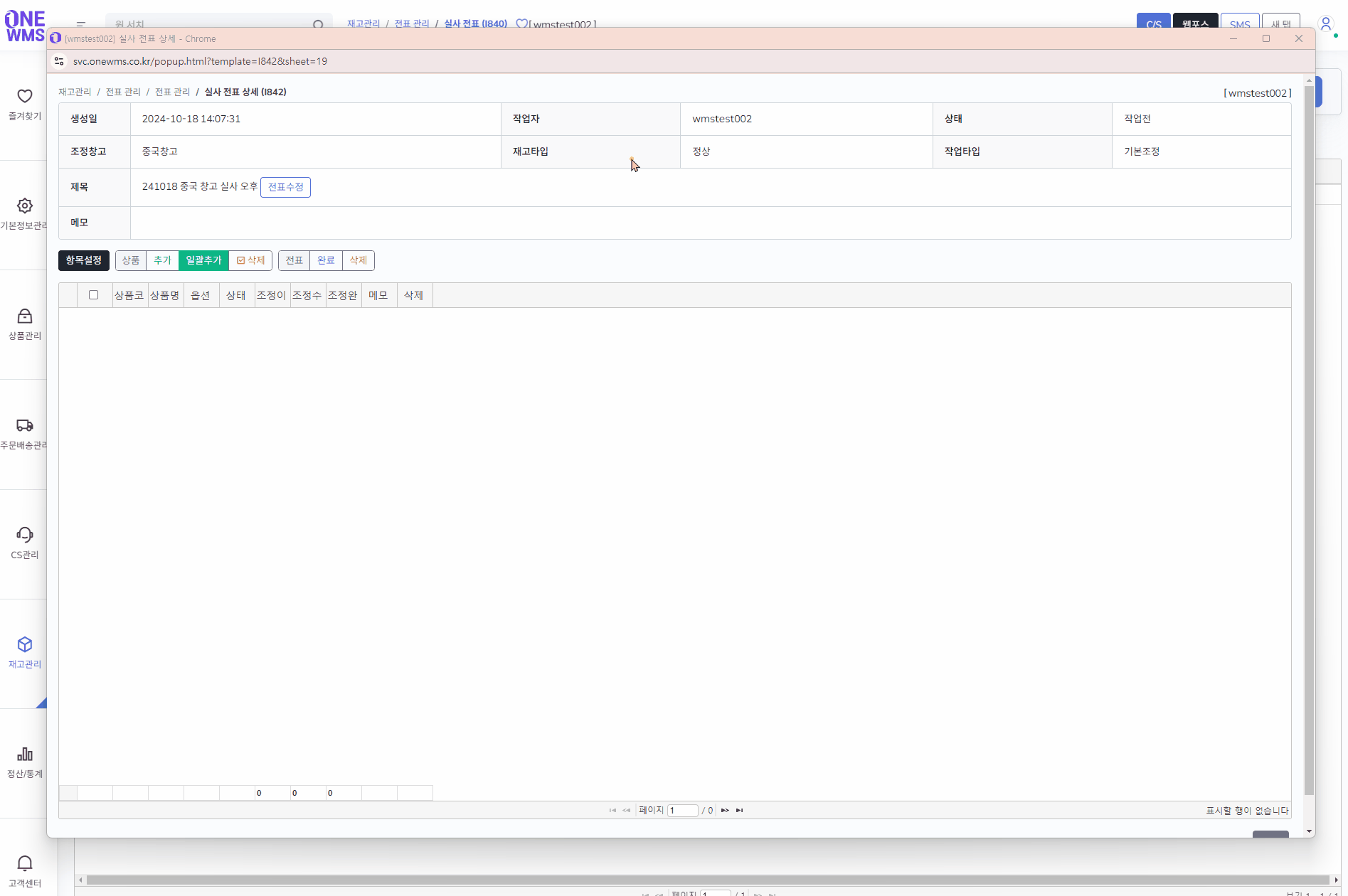 [완료] 버튼을 클릭하면 입력한 조정수량만큼 해당 창고/타입에서 재고가 조정됩니다.
