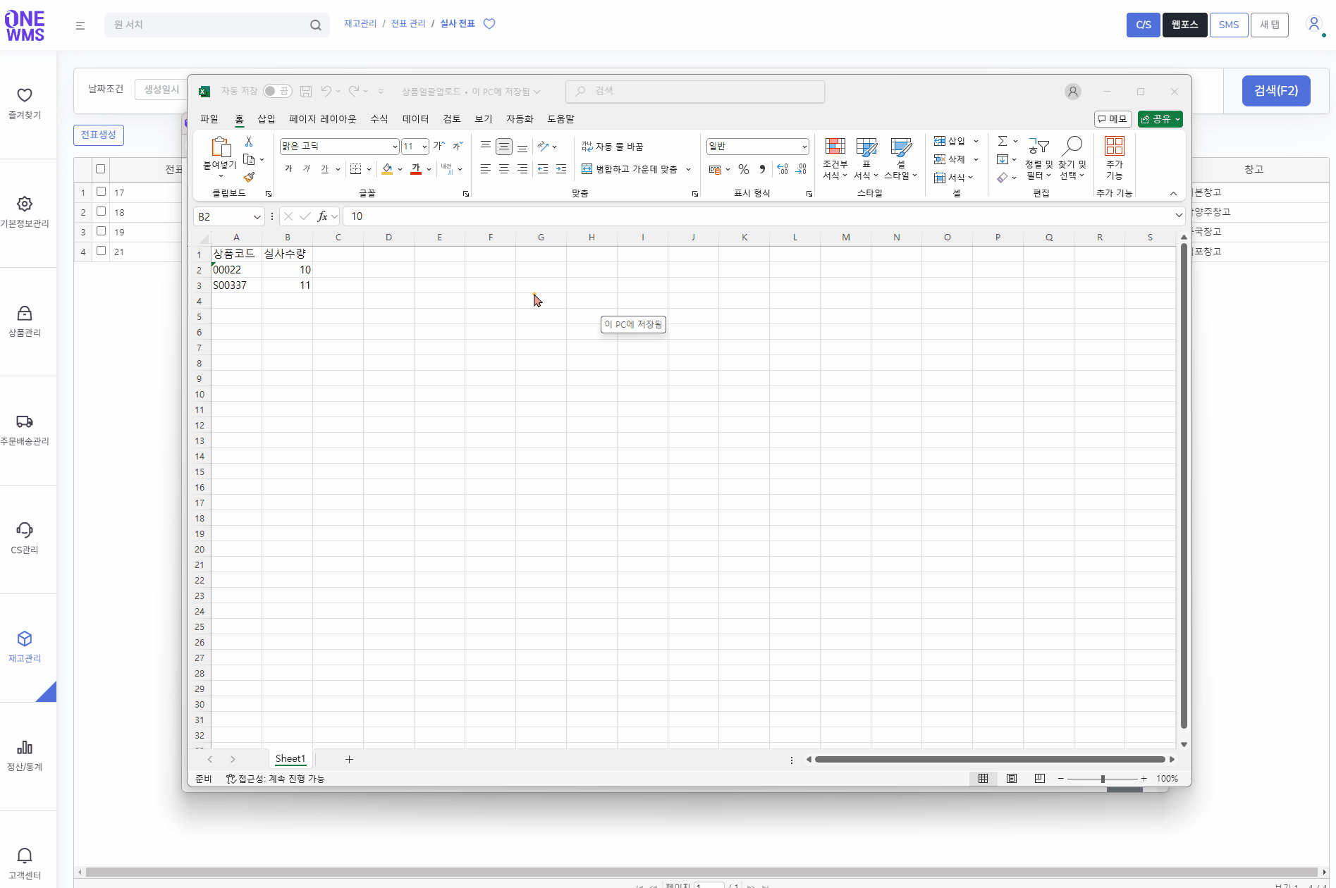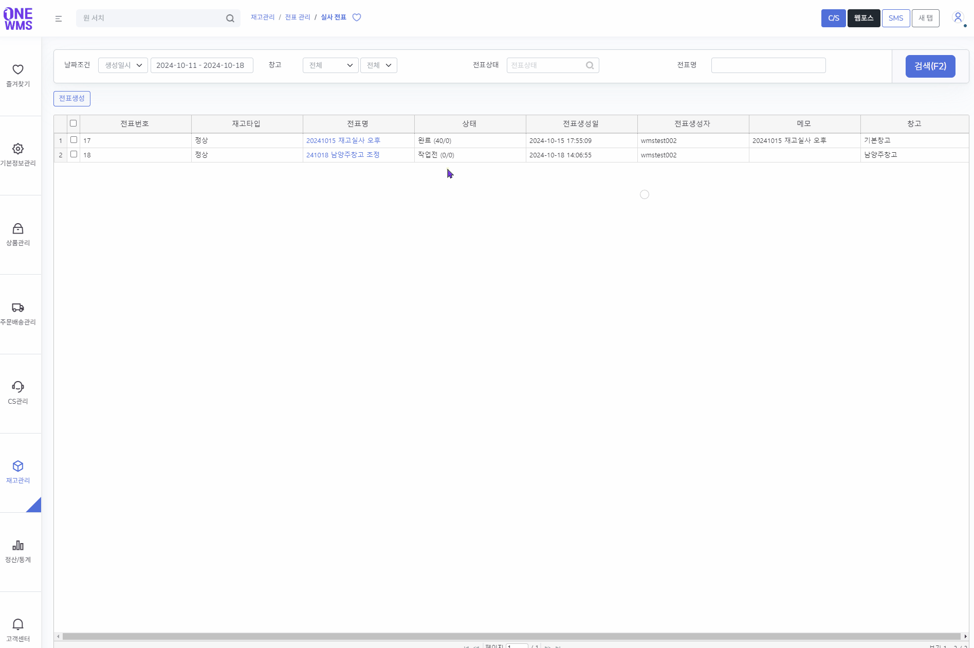 실제 상품재고 수량과 ONE 솔루션 재고를 비교한뒤 해당 정보를 전표 형태로 저장해서 작업 및 관리하는 기능입니다.