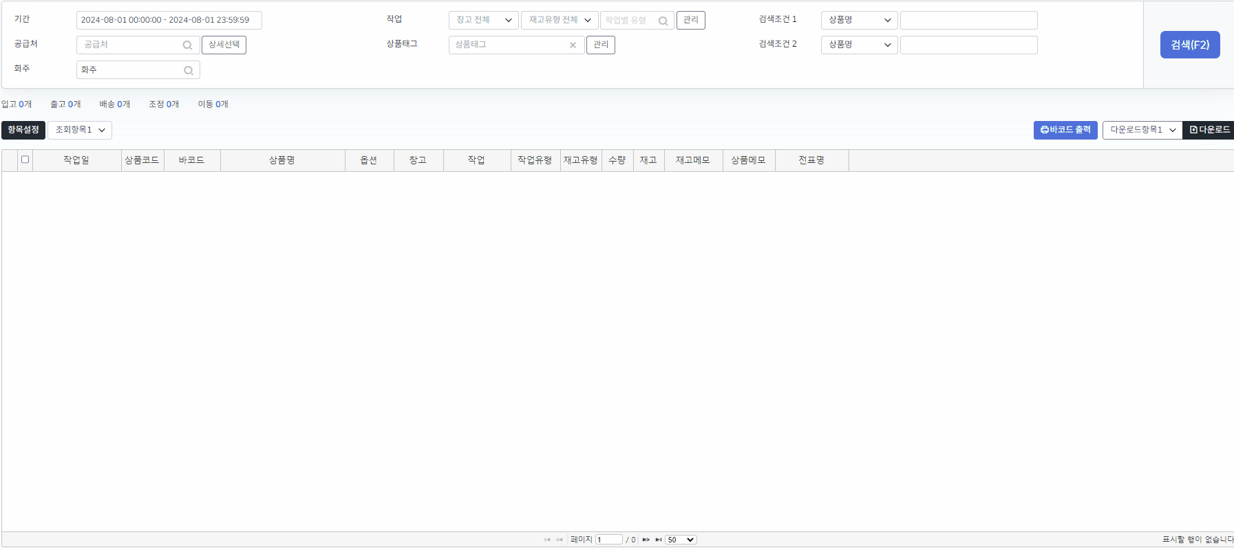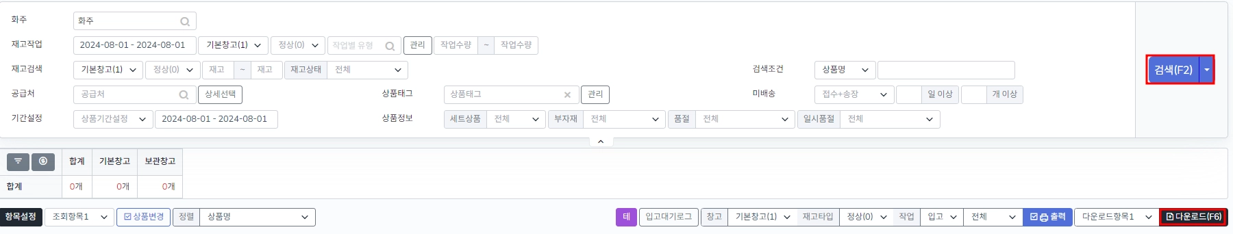 재고관리 > 재고조회에서 작업 할 상품을 검색 후 다운로드 합니다.