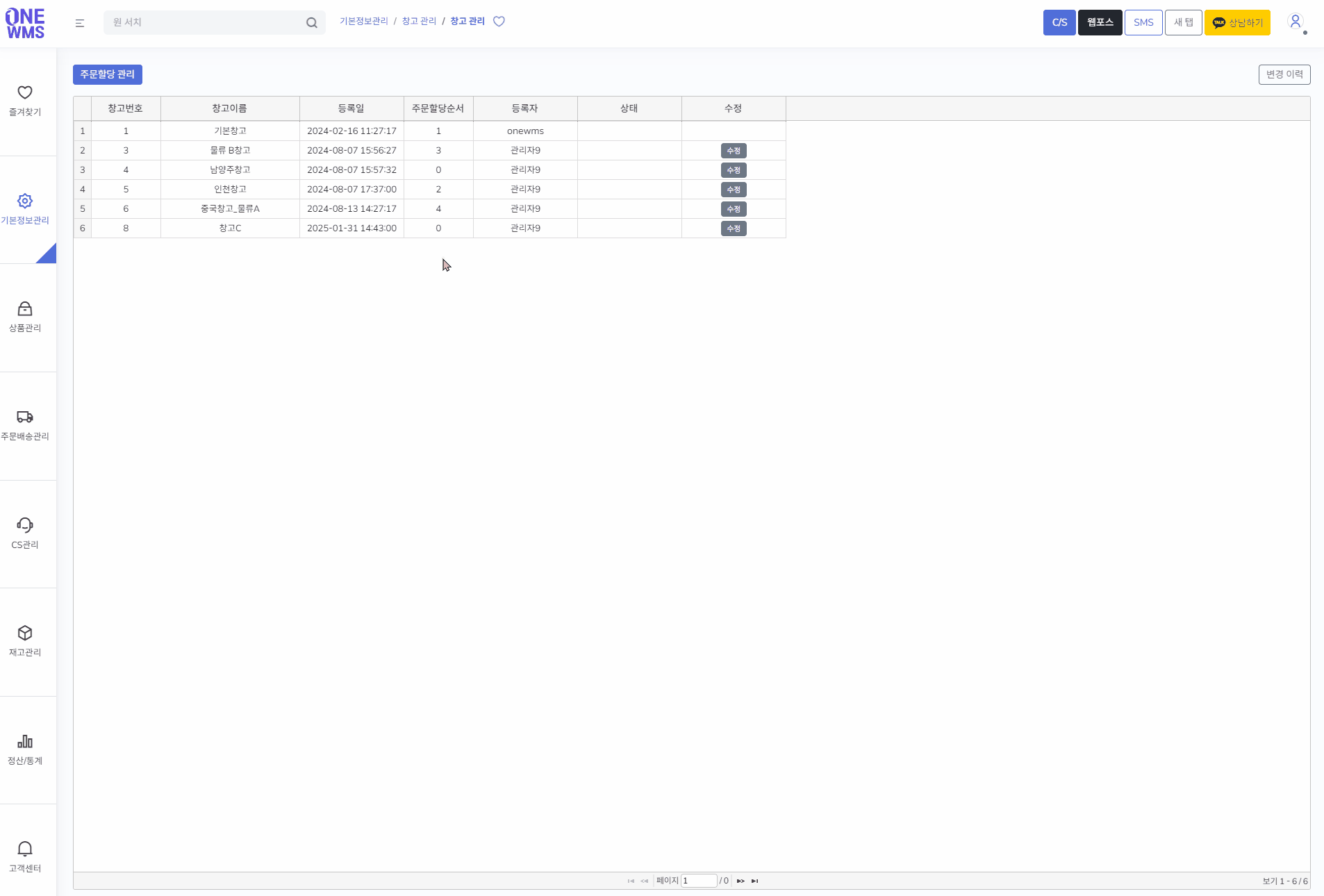 창고 추가 이후, 창고 이름 수정 및 주문할당관리를 할 수 있습니다.