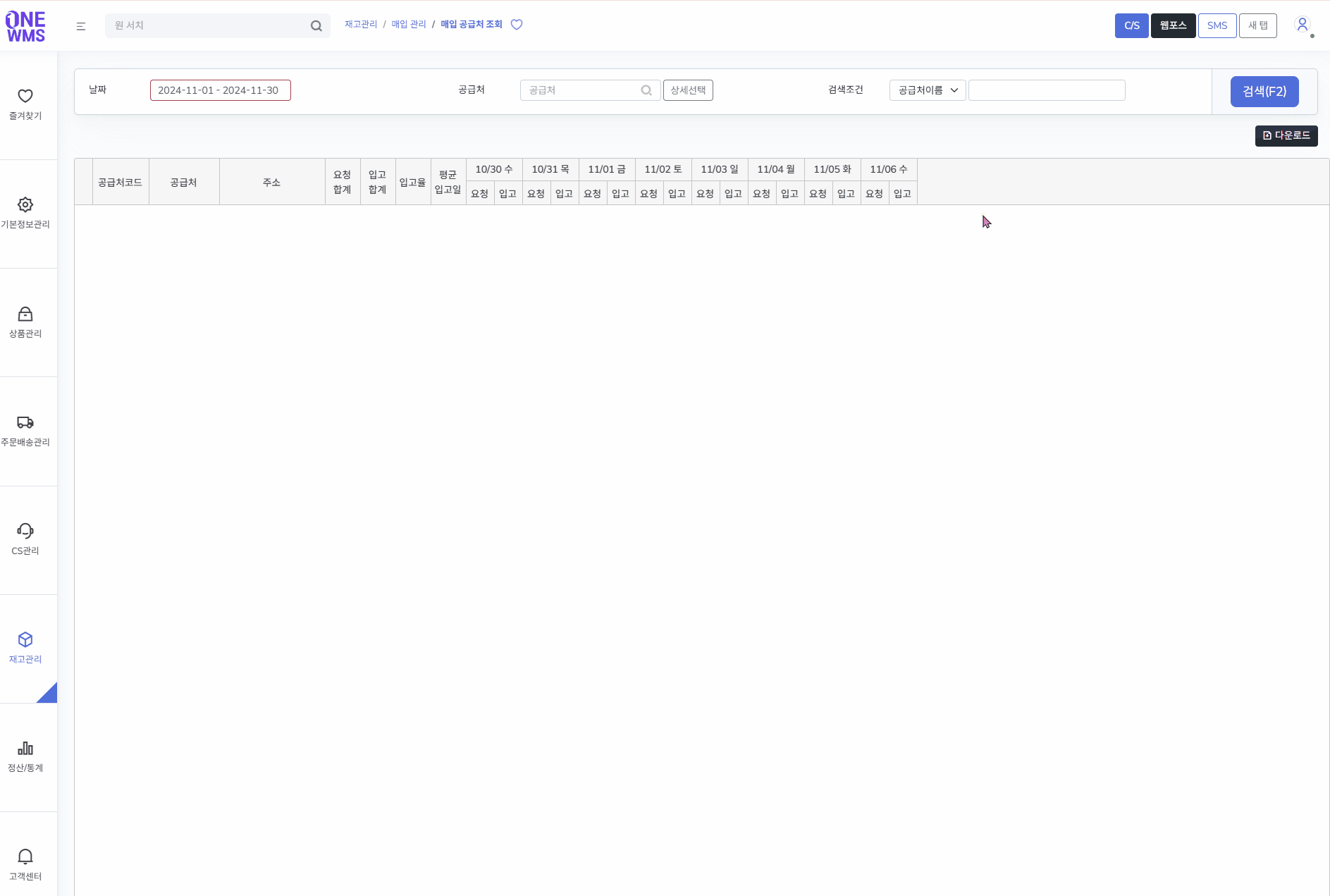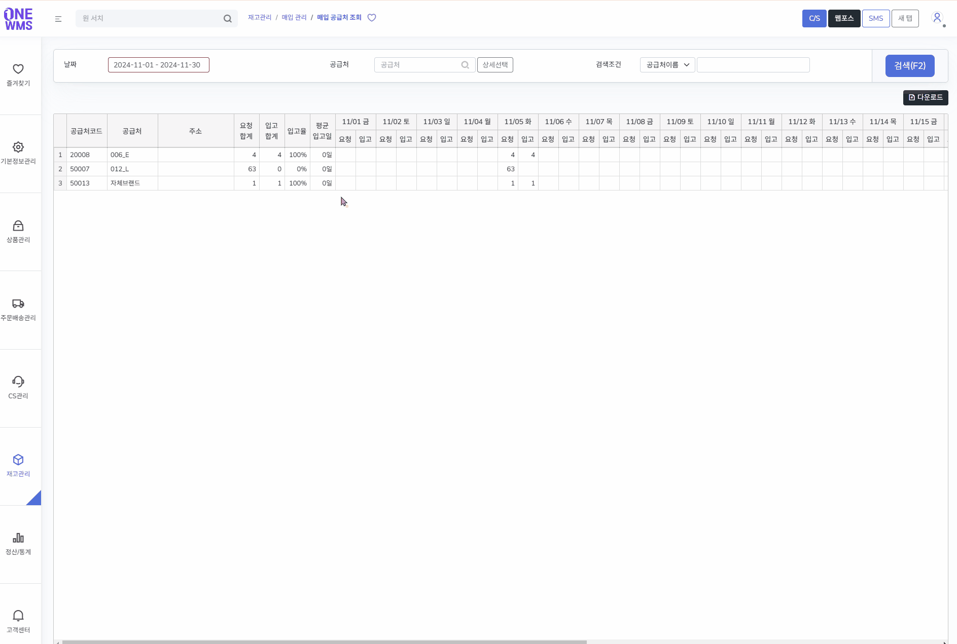 설정한 검색기간에 속한 공급처별 요청/입고 수량이 날짜별로 확인됩니다.