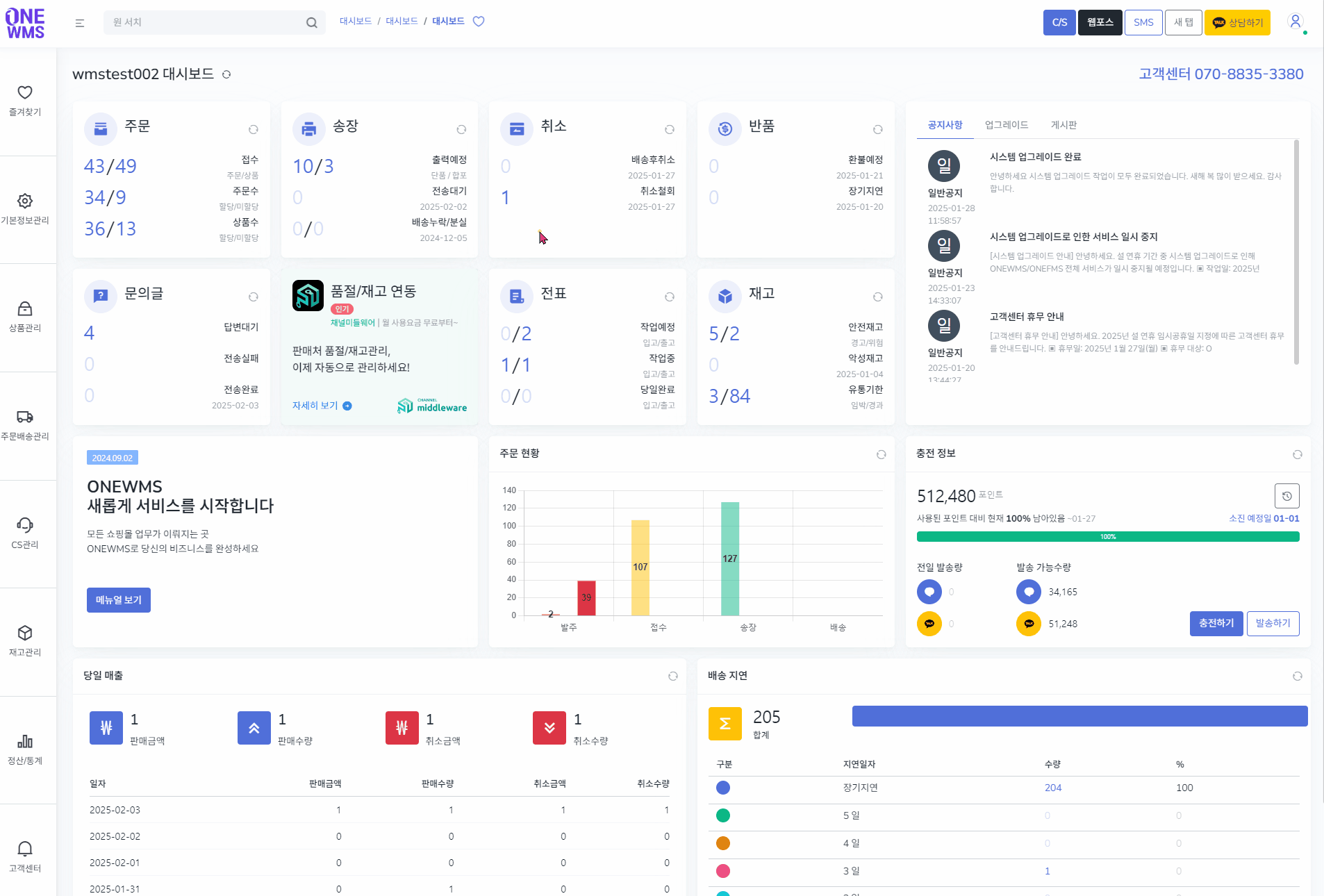 메인 대시보드는 최근 일주일간 취소철회가 된 주문을 확인할 수 있습니다.