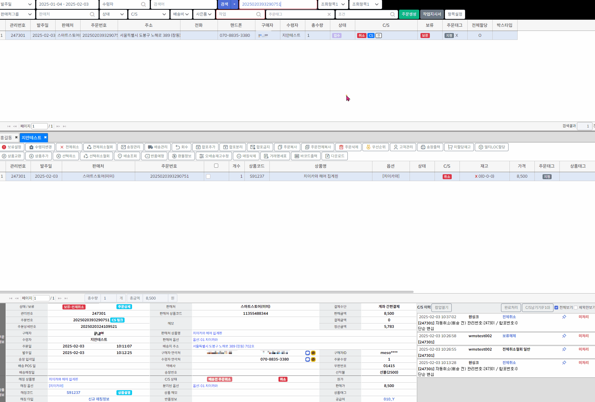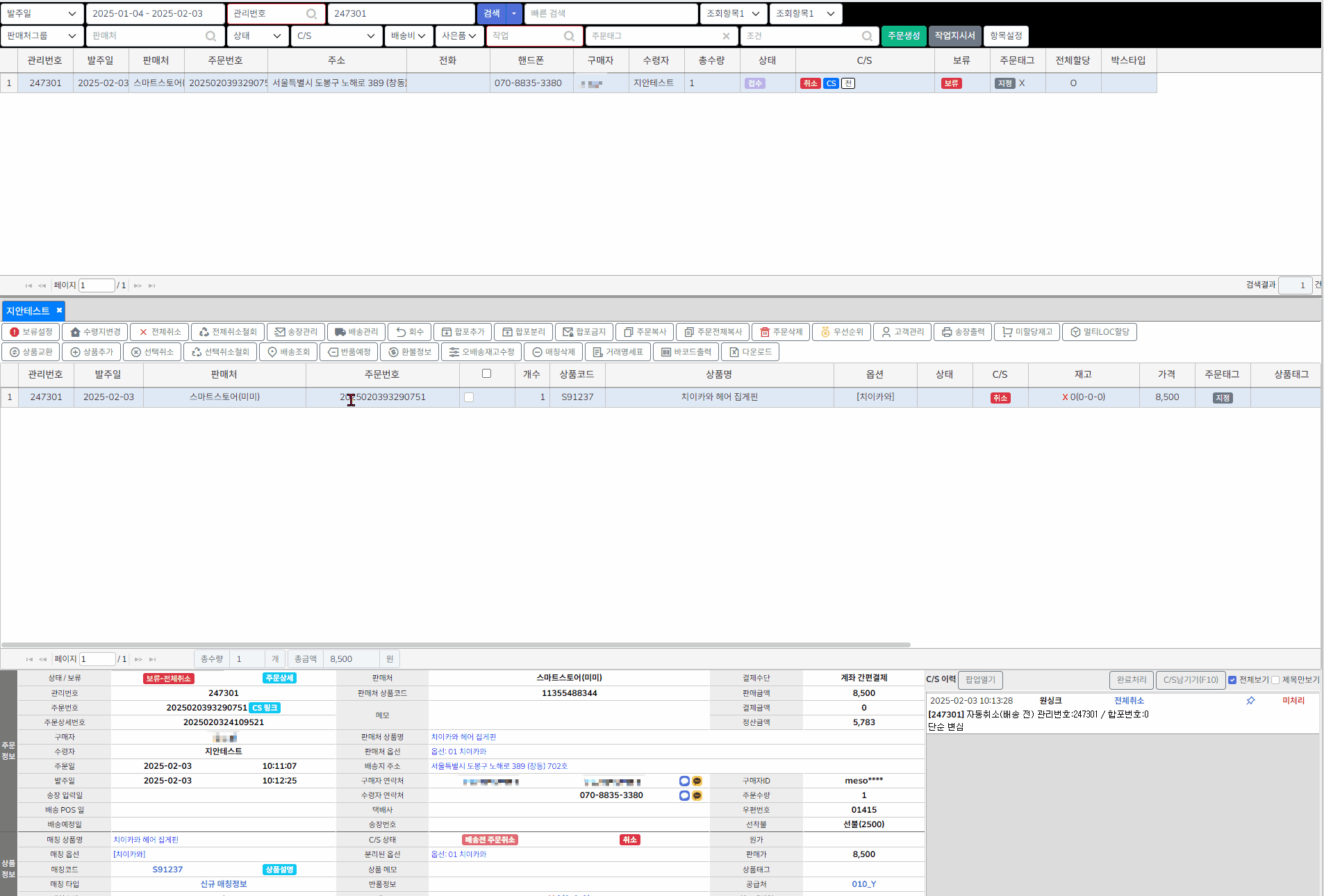 ONE솔루션 에서는 취소상태이지만, 판매처에서는 정상상태 주문이 조회됩니다.