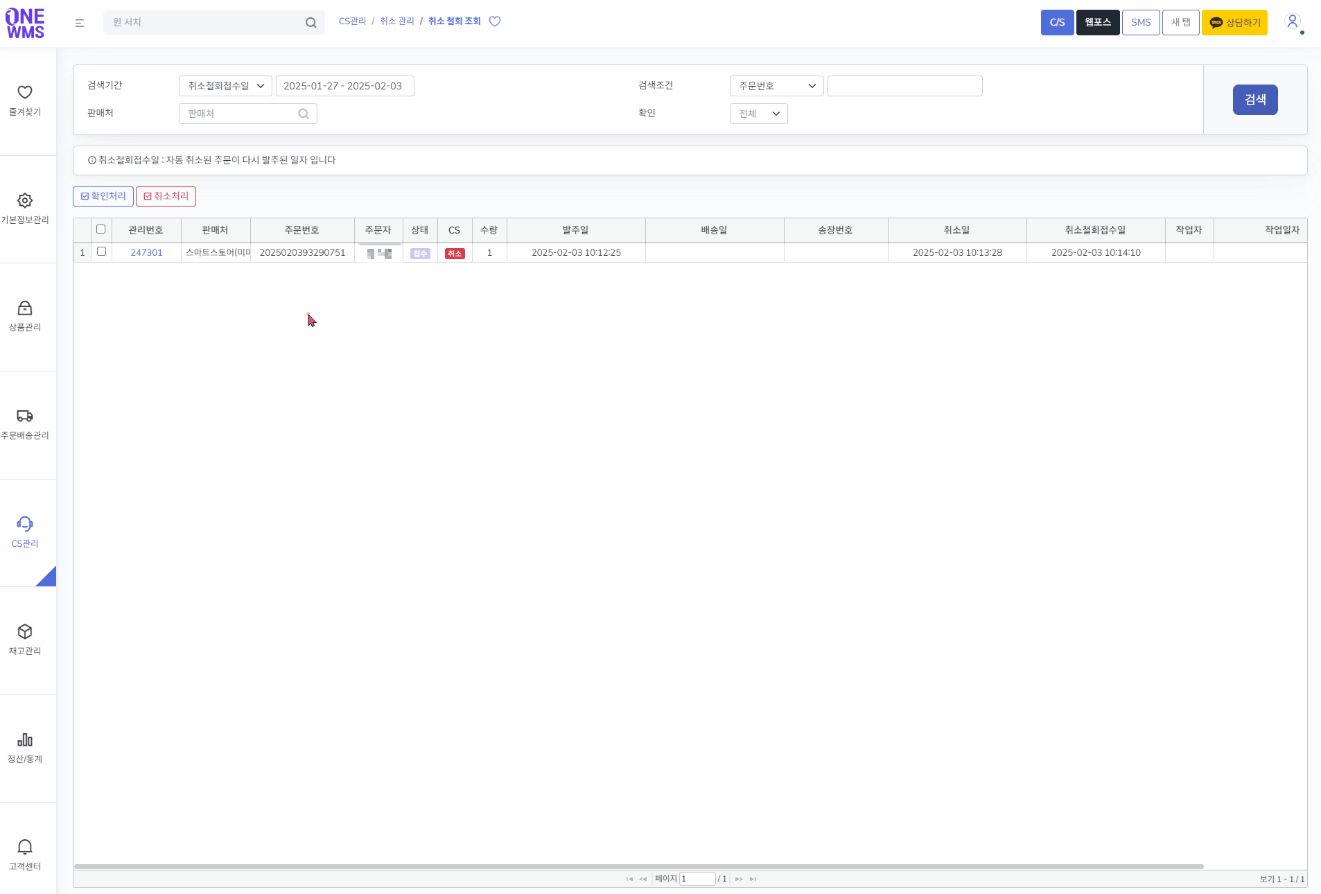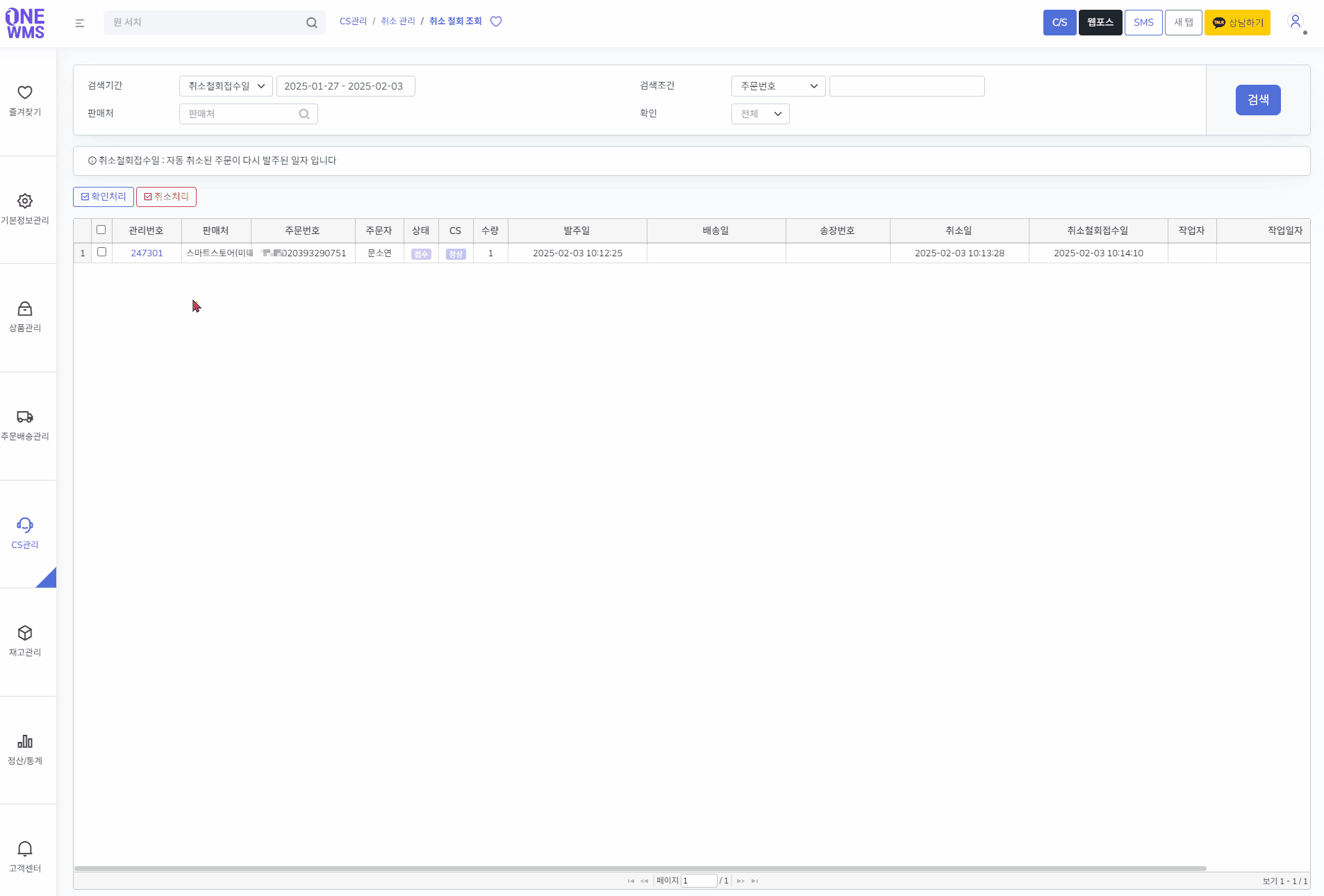 2) [CS관리 > 취소 관리 > 취소 철회 조회]