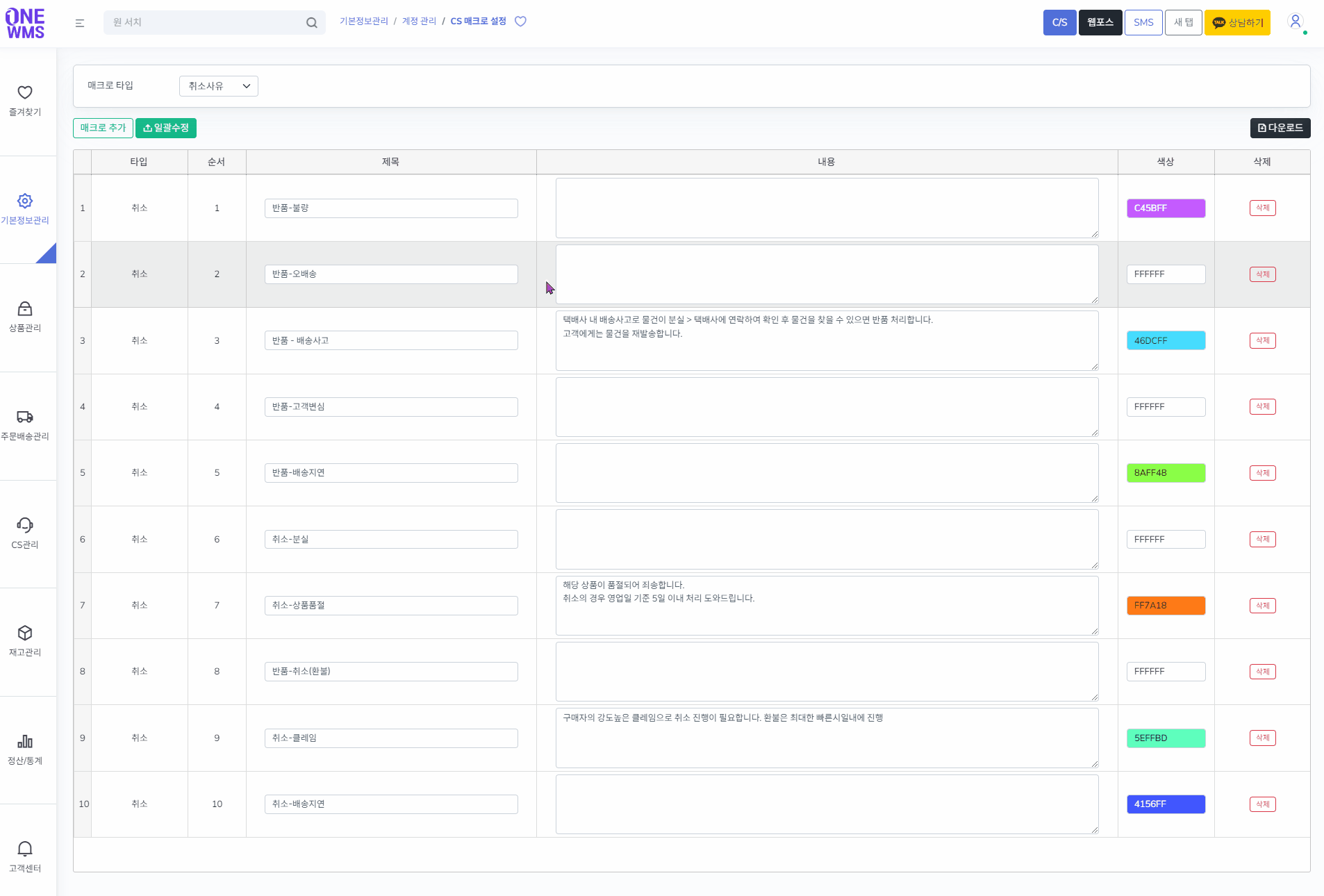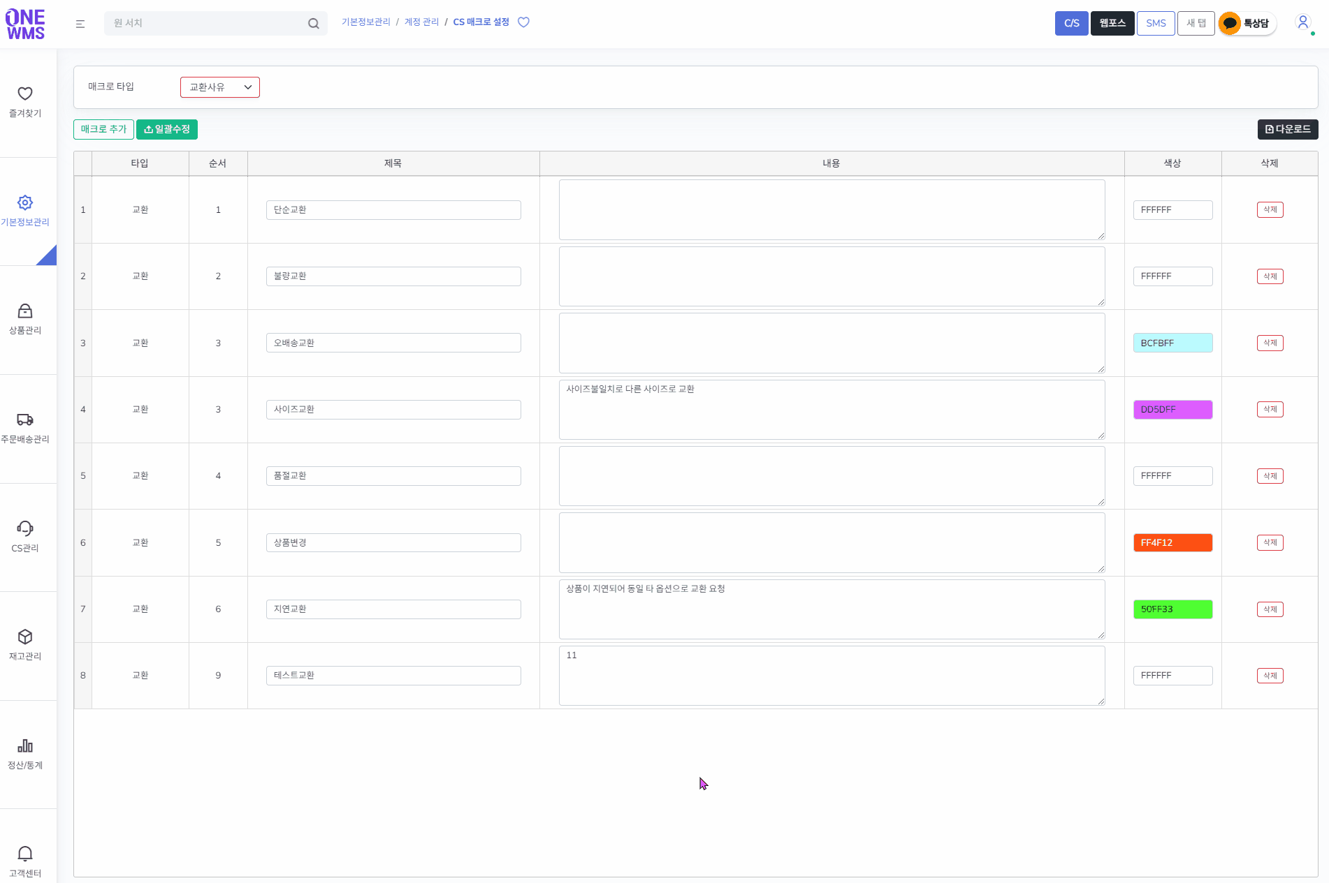 메뉴 경로 : [기본정보관리 > 계정관리 > CS 매크로 설정]