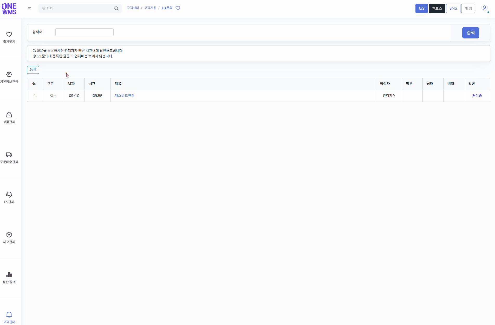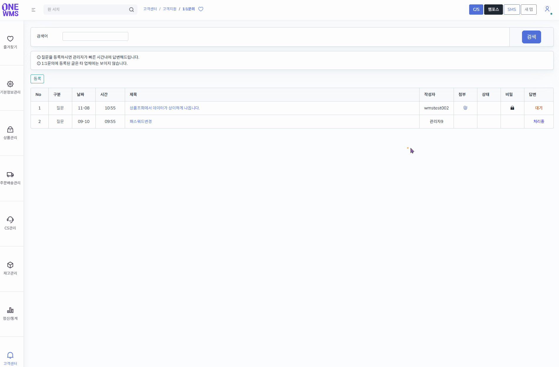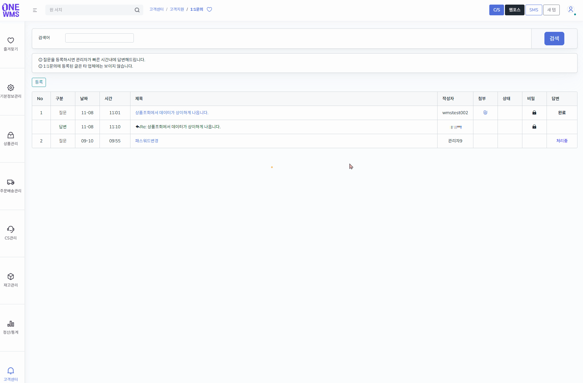* 1:1문의에 등록된 글은 타 업체에는 보이지 않습니다.