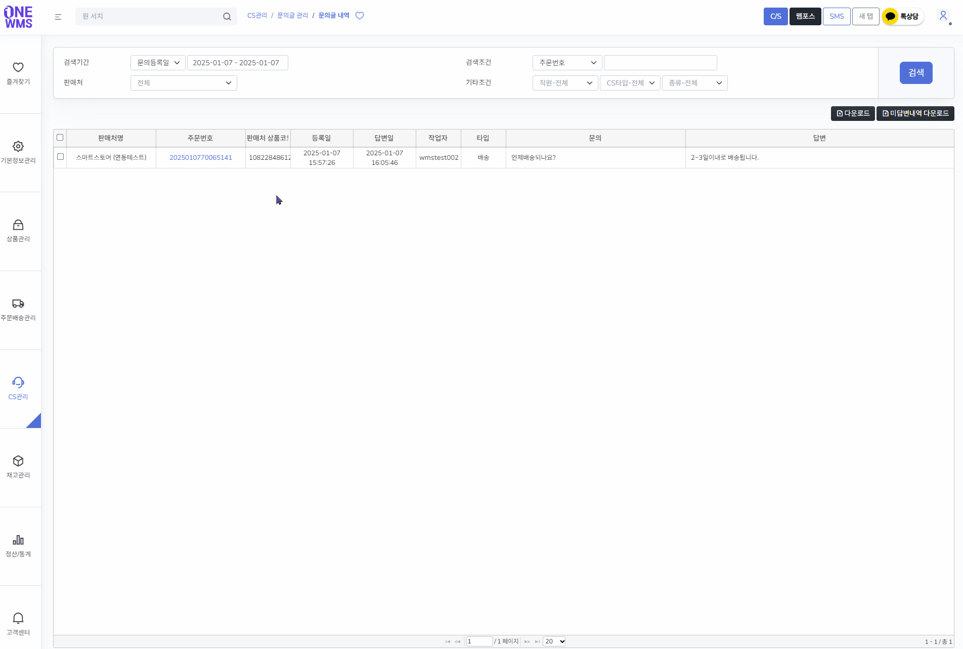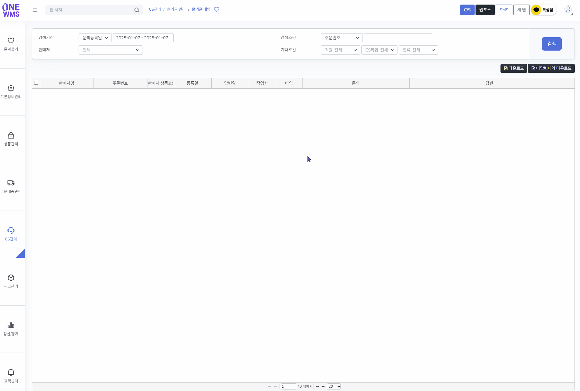 메뉴 경로 : [CS관리 > 문의글 관리 > 문의글 내역]