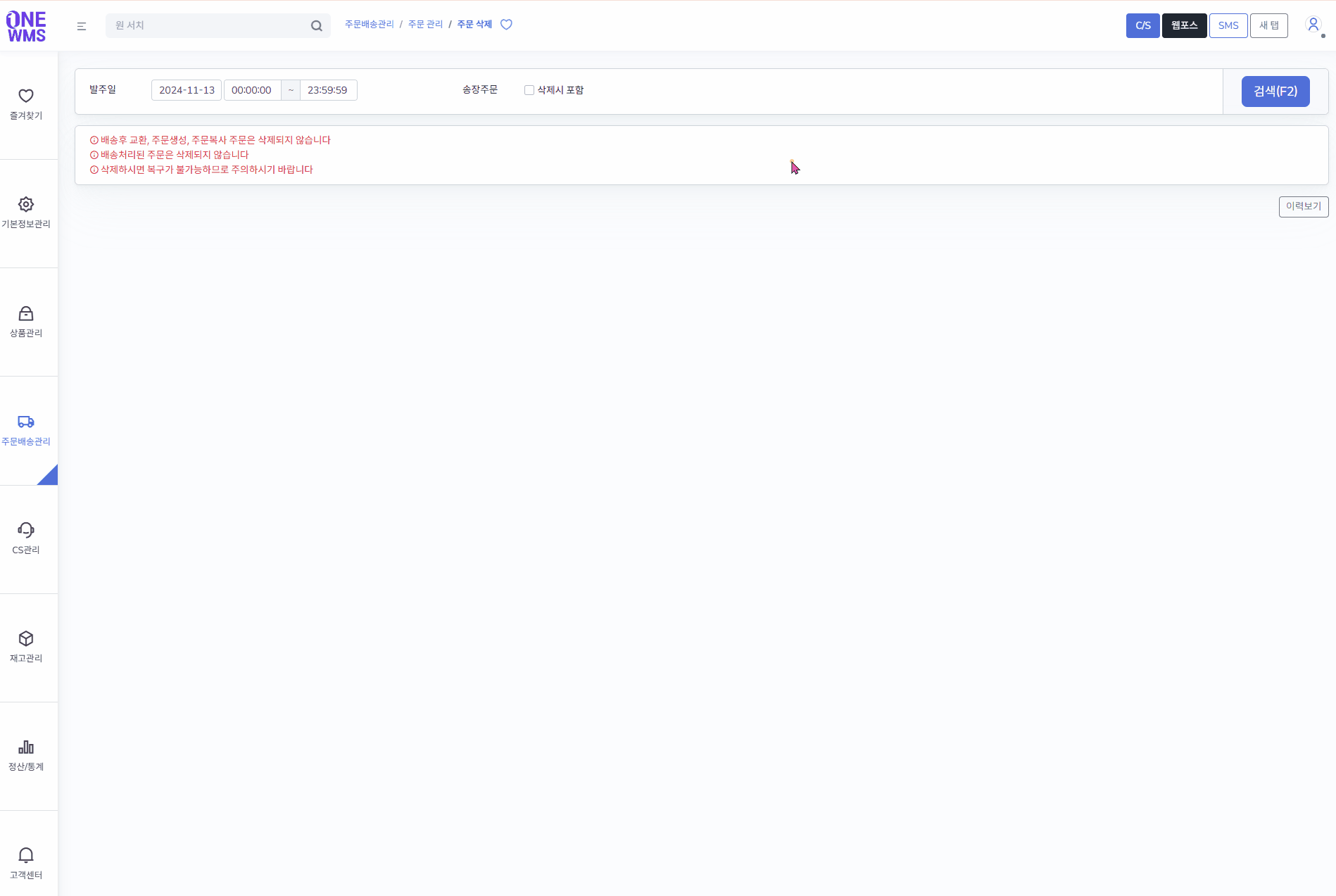 메뉴 경로 : [주문배송관리 > 주문 관리 > 주문 삭제]