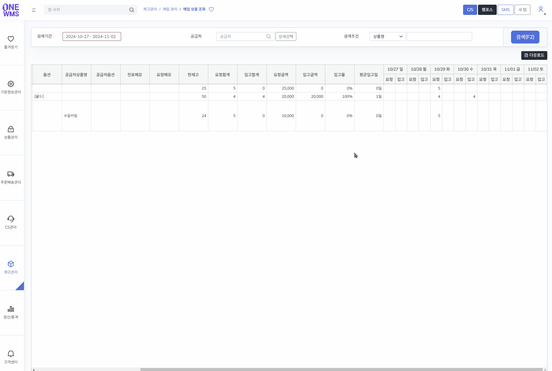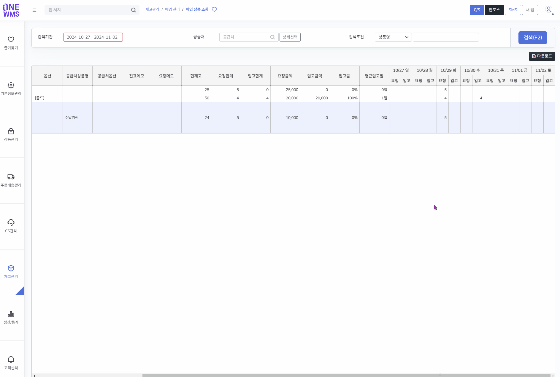 설정한 검색기간에 속한 상품별 요청/입고 수량이 날짜별로 확인됩니다.