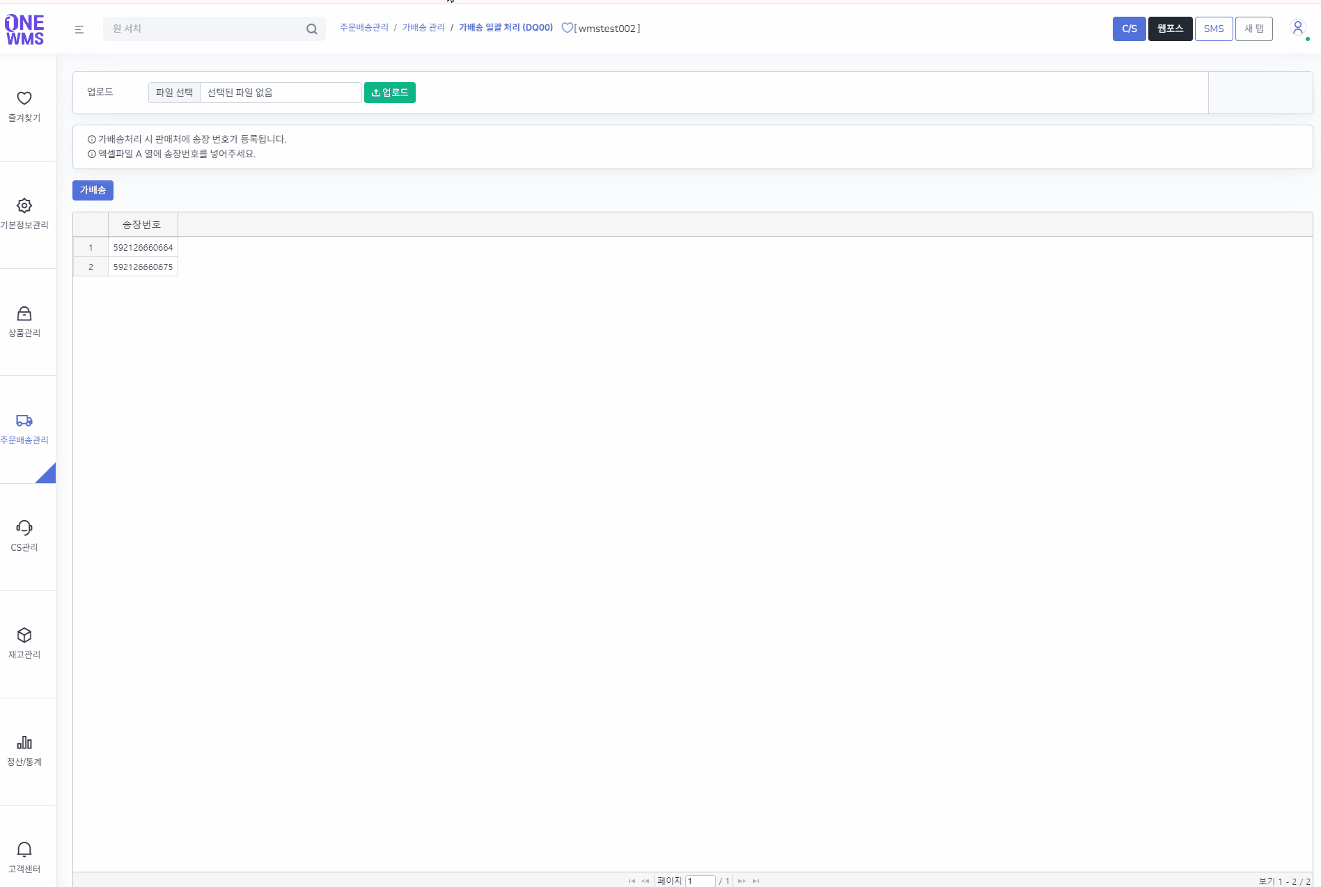 가배송 상태의 주문은 ONEWMS 내에서는 송장 상태입니다.