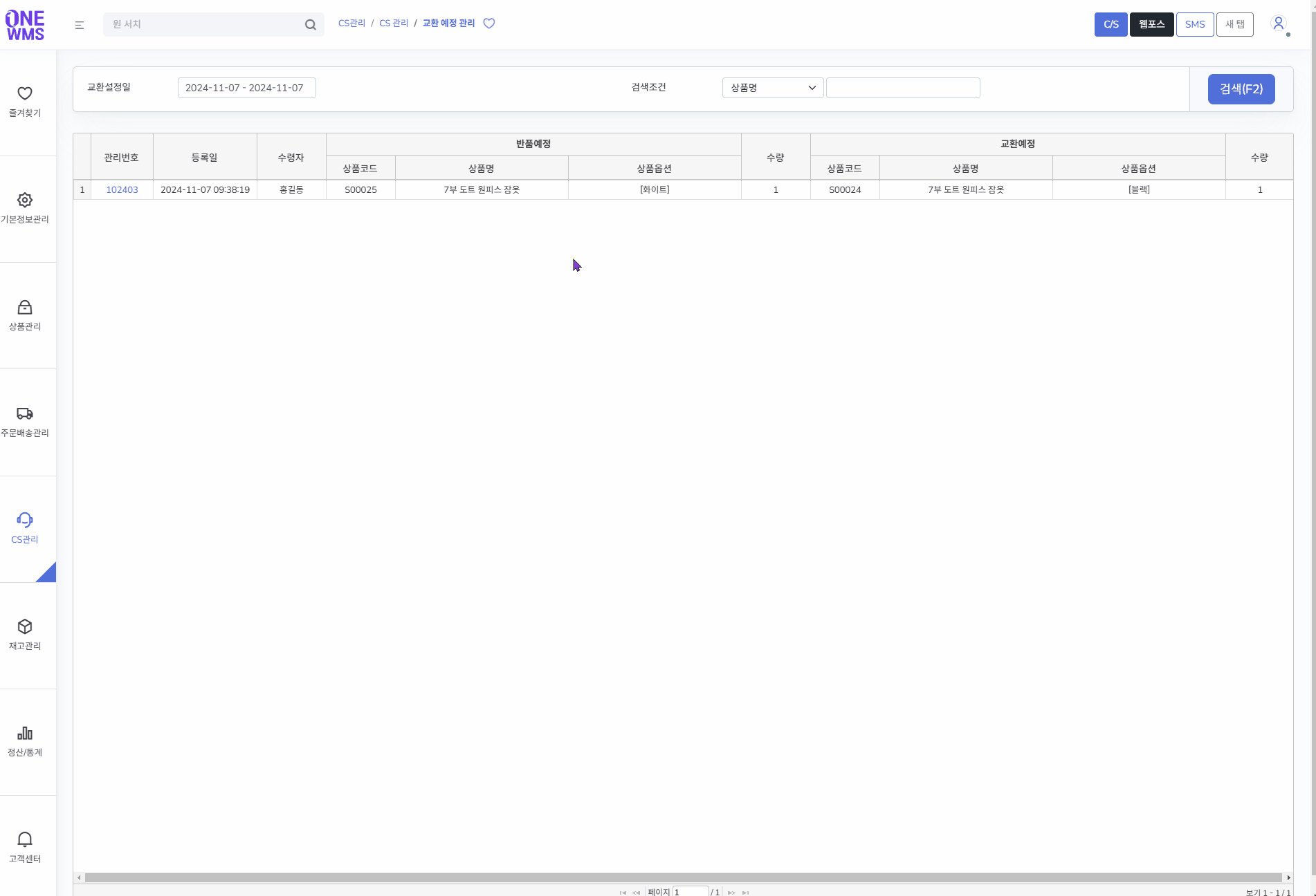 메뉴 경로 : [CS관리 > CS 관리 > 교환 예정 관리]