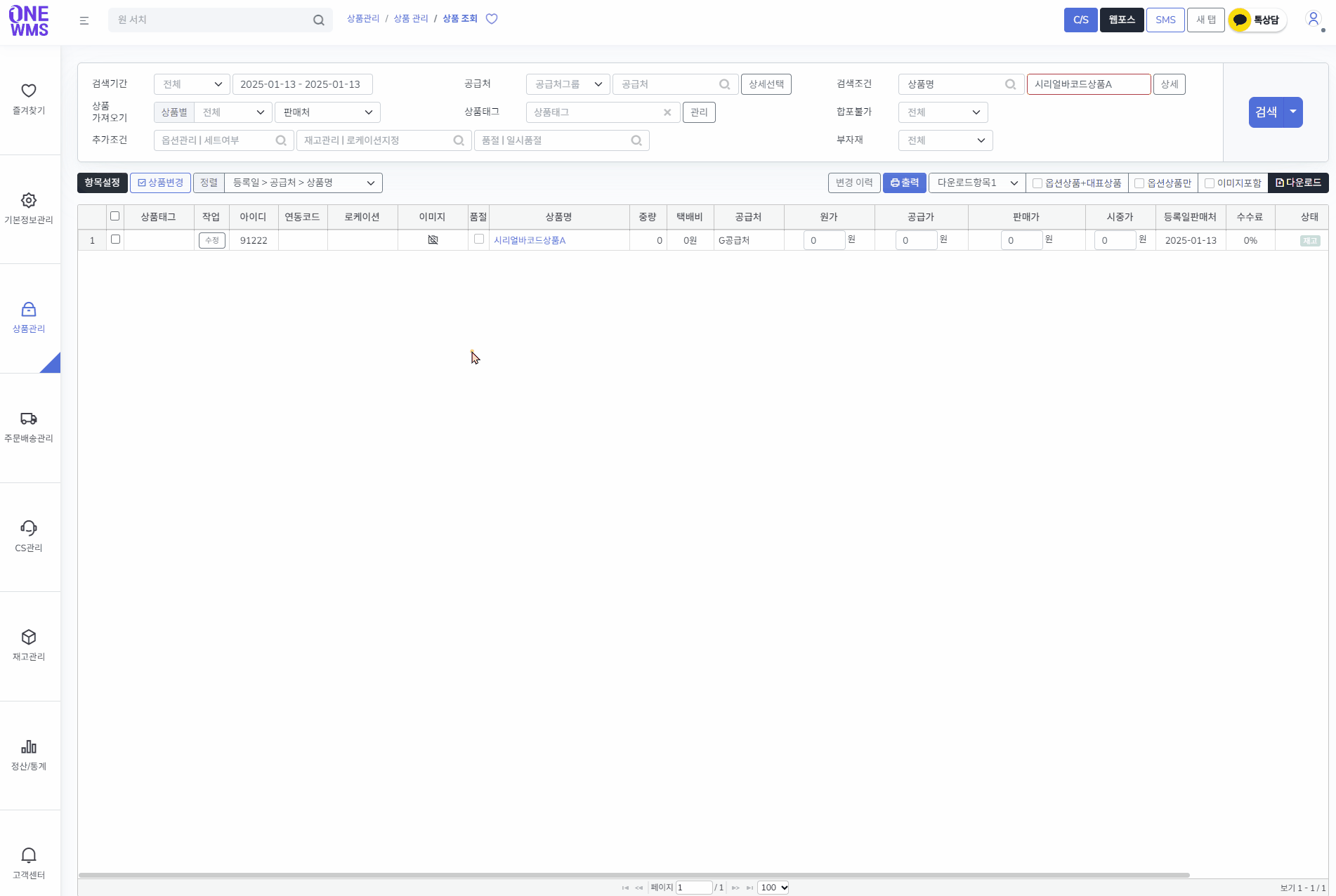단품상품의 경우, [상품관리 > 상품조회] 에서 해당 상품의 [수정] 버튼을 클릭하여 수정이 가능합니다.