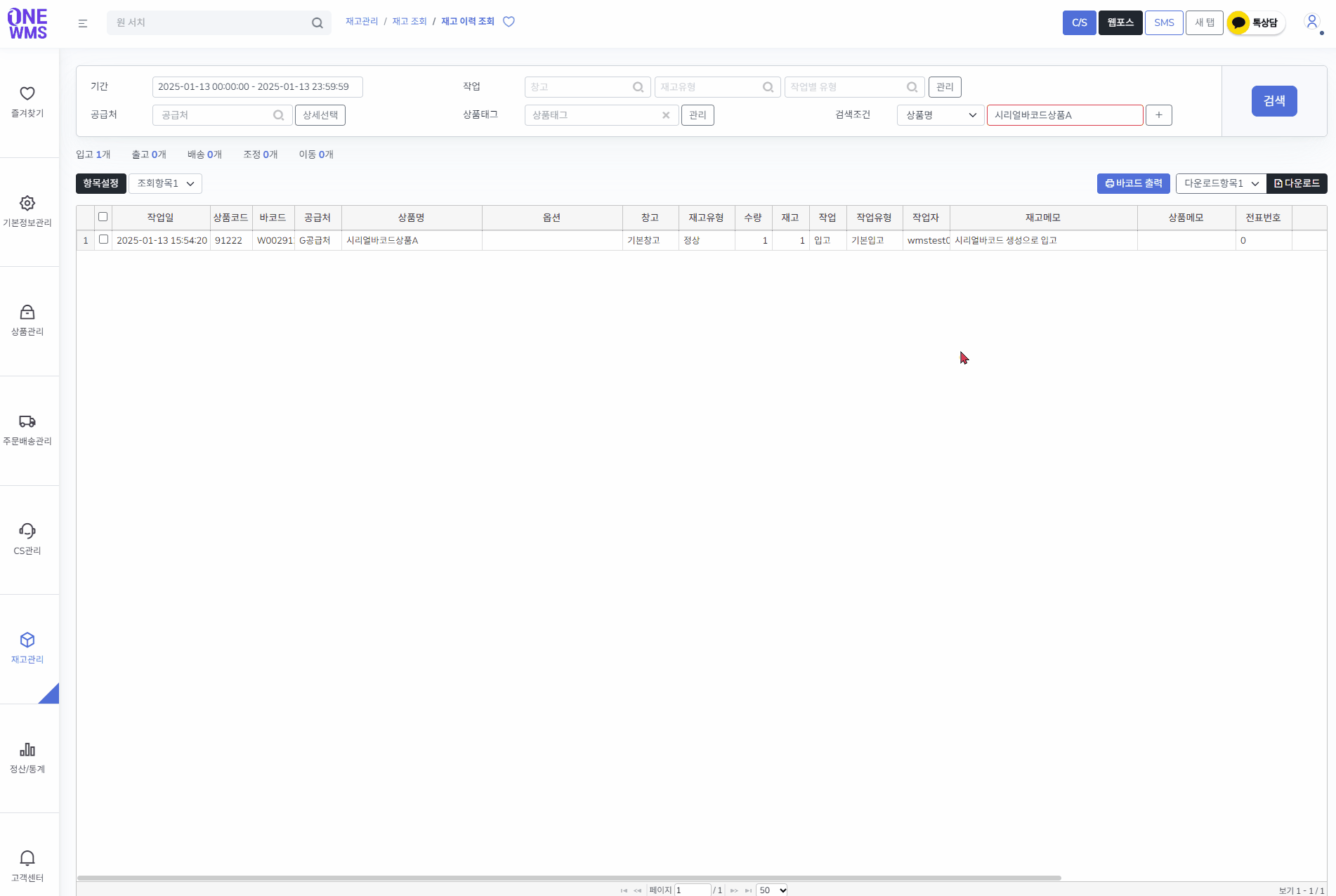 [재고관리 > 재고이력조회] 에서 입고된 이력을 확인할 수 있습니다.