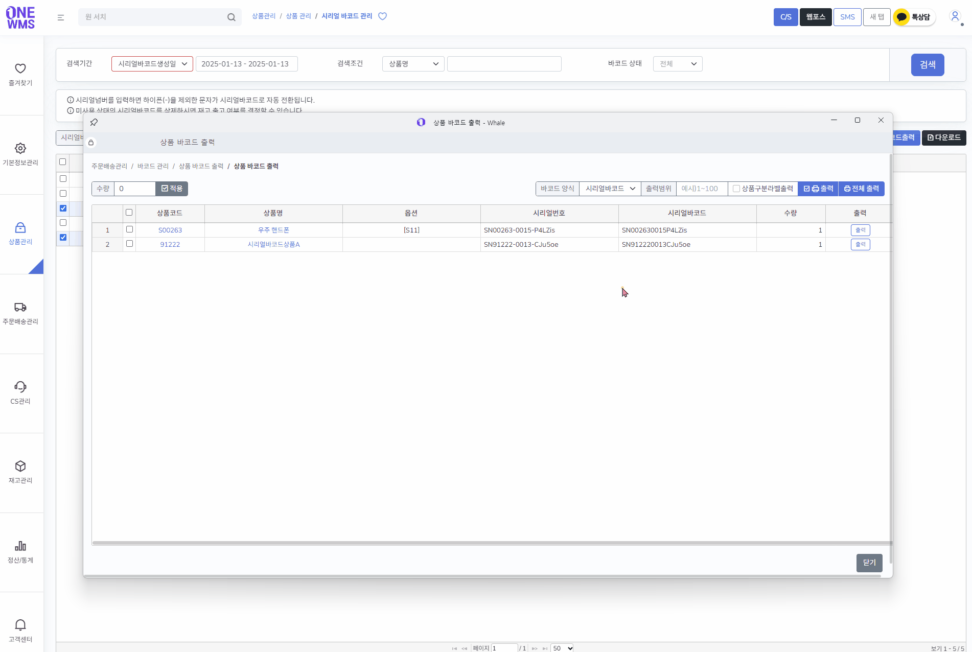 바코드 출력한 시리얼 상품은 상태가 미사용>출력으로 변경됩니다.