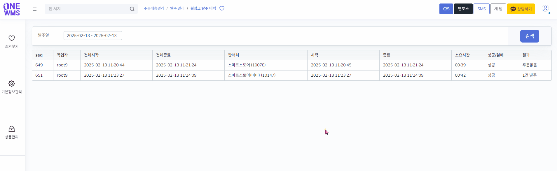 메뉴 경로 : [주문배송관리 > 발주 관리 > 원싱크 발주 이력]