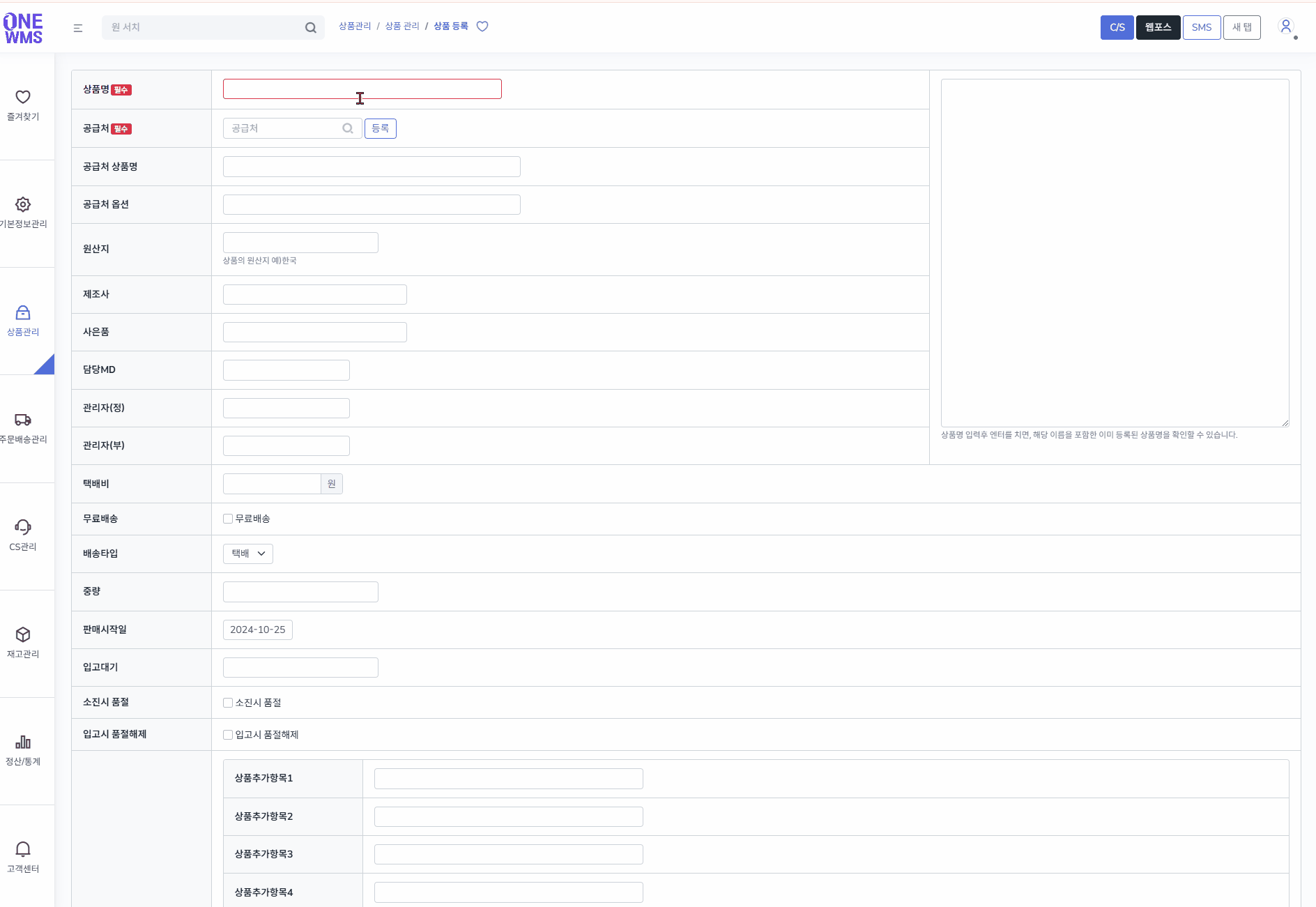 상품의 옵션 / 원가 / 로케이션 등 필요 정보들을 작성하여 등록합니다.