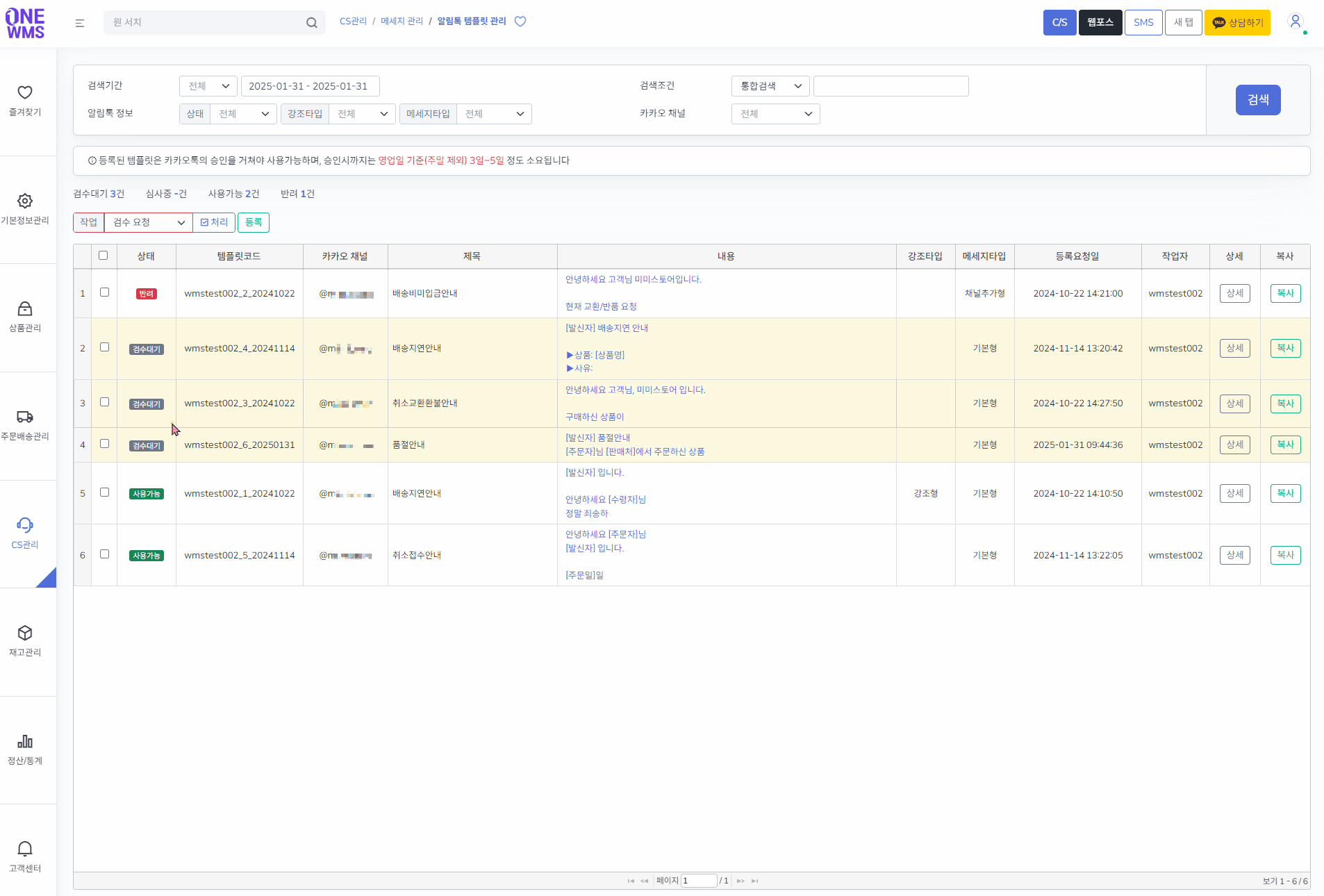 저장된 템플릿은 [검수대기] 상태로 확인 됩니다.