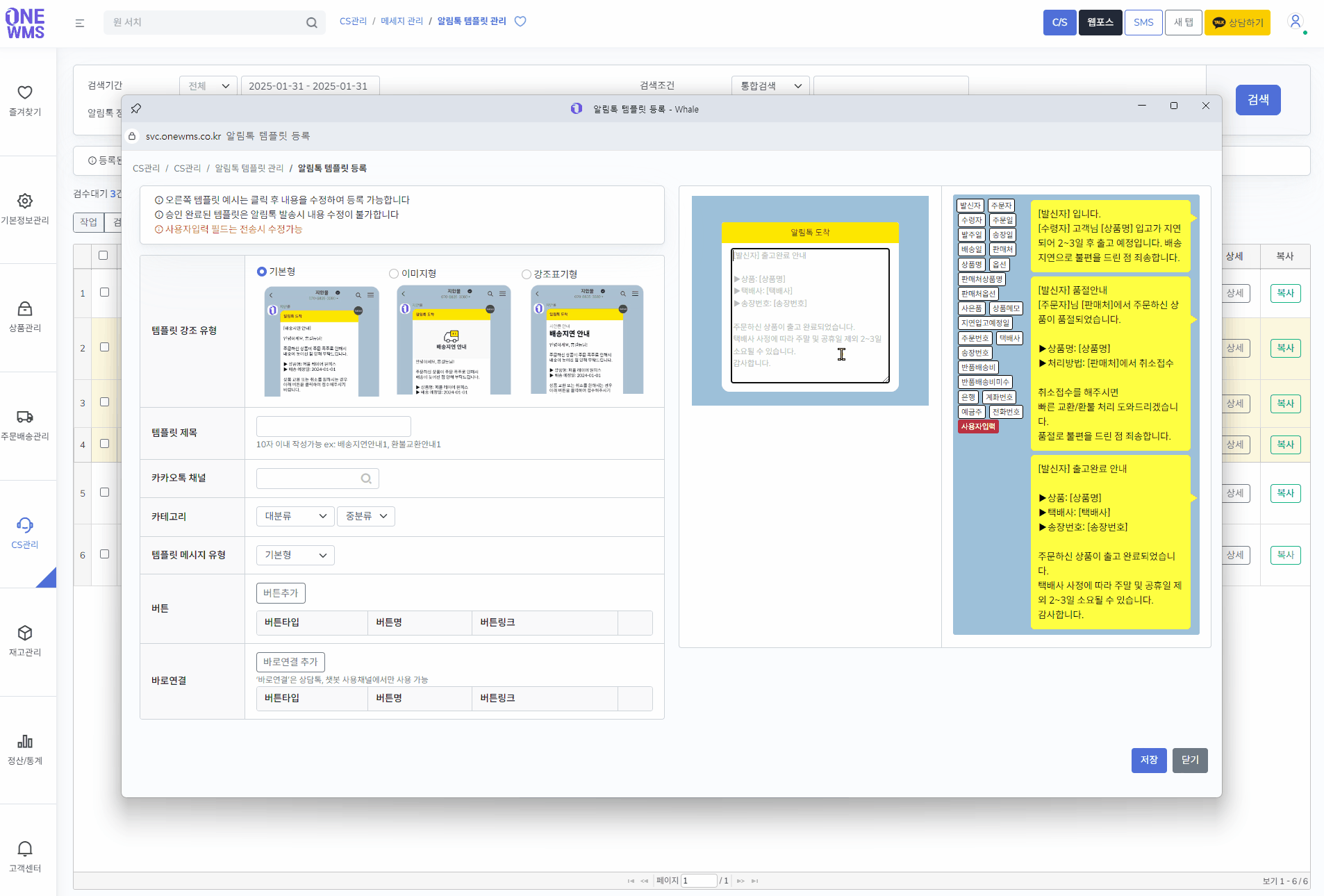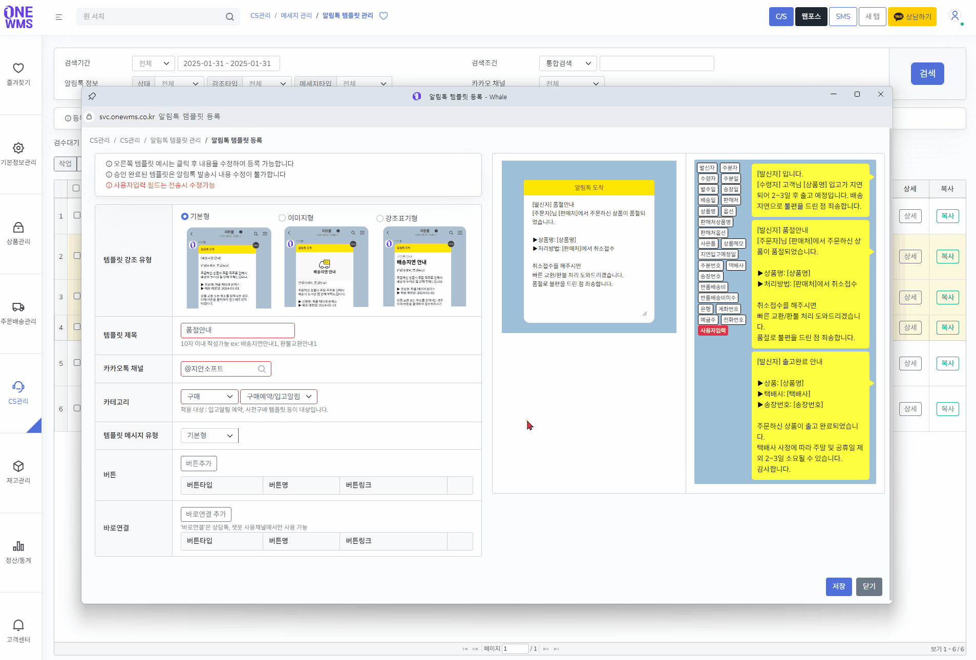 메뉴 경로 : [CS관리 > 메세지 관리 > 알림톡 템플릿 관리]