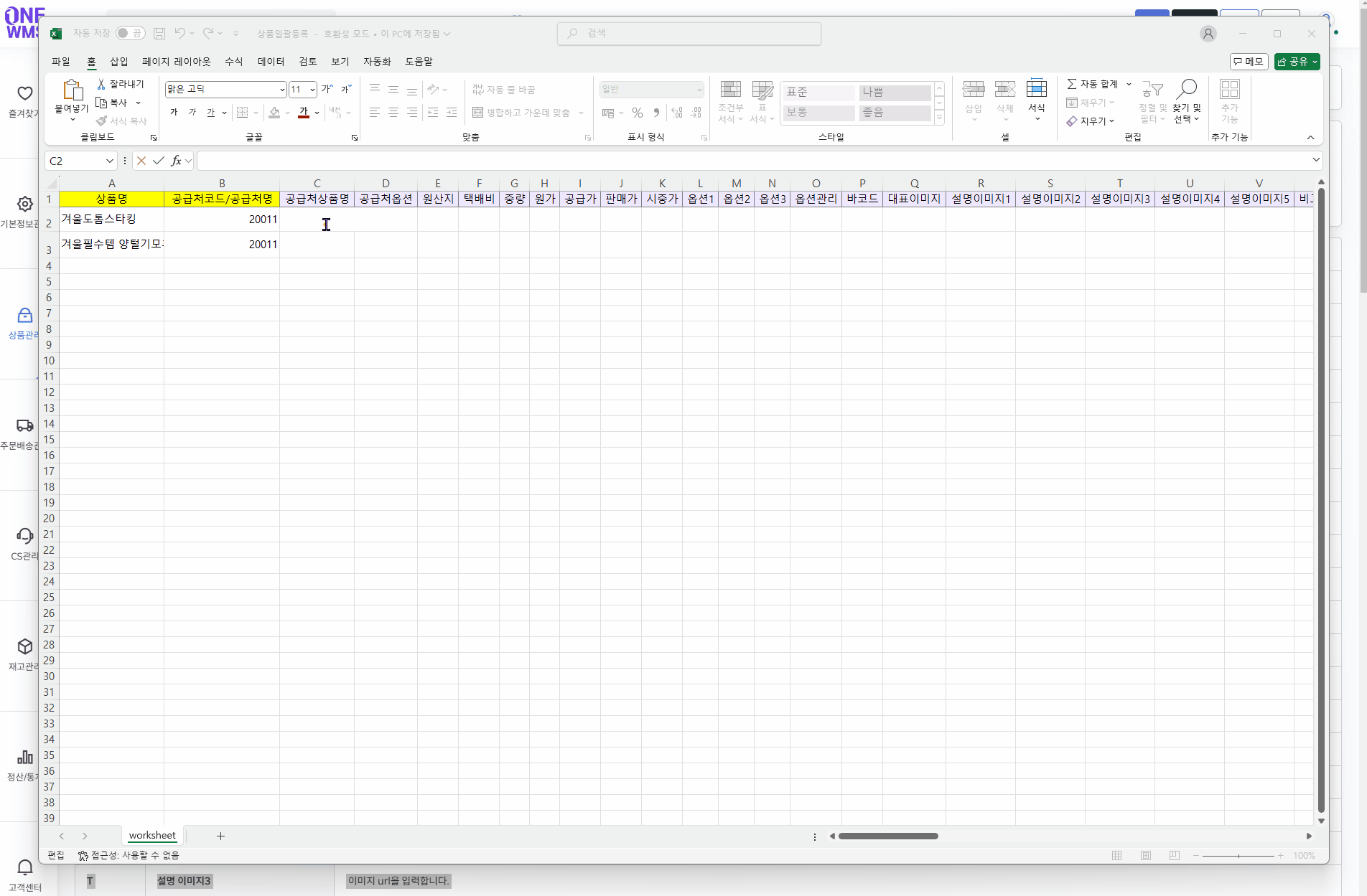 엑셀에서 그외 작성하고 싶은 정보를 작성합니다. (공급처 상품명, 원산지, 제조사 등)