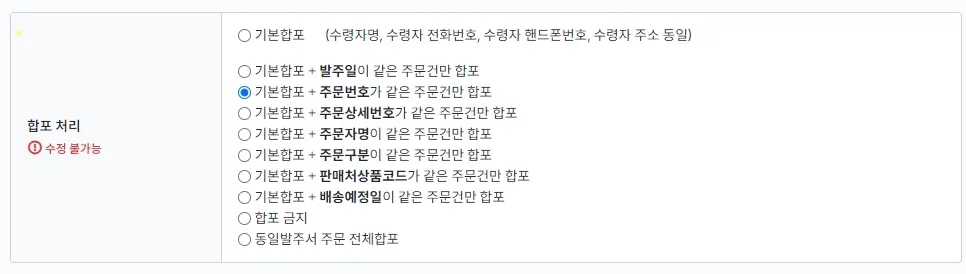 합포조건은 주문과 송장출력에 영향이 갑니다. 신중하게 요청 부탁드립니다.